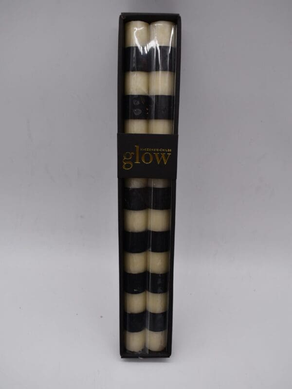 Turn your everyday meals into something more memorable with our Black Bands Dinner Candles. They feature a fun and fresh hand-painted pattern of horizontal stripes that add the glowing touch of MacKenzie-Childs to your dining table. This set of two beeswax-blend candles will cast a lovely lustre on your table for up to 10 hours.