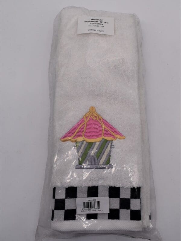 The set of two Birdhouse Hand Towels will have your guest bath chirping with style. They feature a pretty birdhouse embroidered on a background of plush 100% cotton terry that’s trimmed with a woven border of black and white checks. Pair them up with the matching set of two Birdhouse Fingertip Towels layered on top.