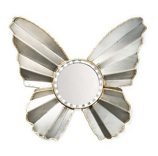 Our Butterfly Wall Mirror is a winged wonder. Shaped like a butterfly with metal wings, trimmed with brass edging, the center mirror features bone and horn inlay around its circumference.