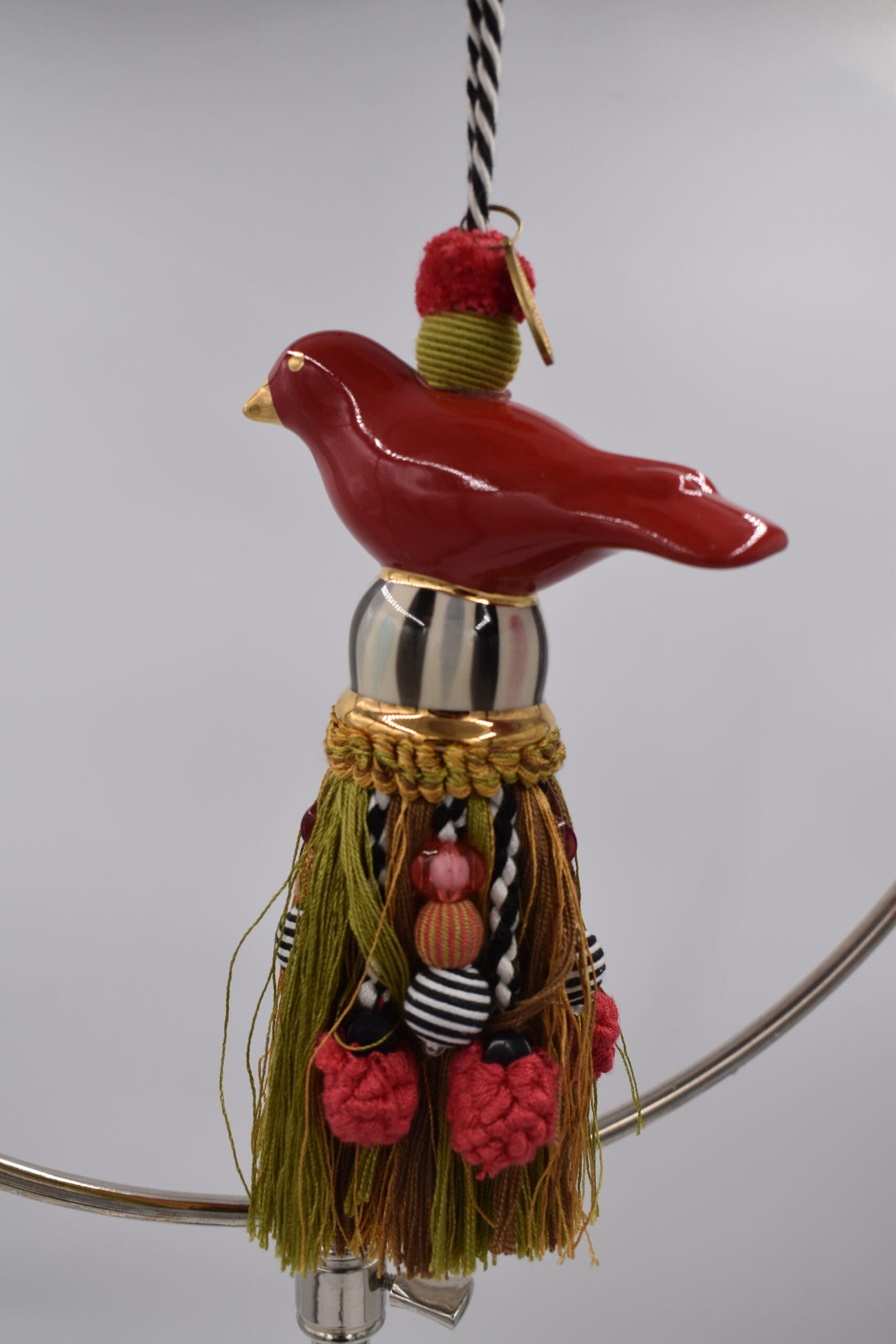 This songbird tassel has so much personality you can practically hear it sing! The Red & Gold Ceramic Bird Tassel is a fine fledgling in hand-painted ceramic with passementerie tassels and trims. Decorate door knobs, finials or curtains, or use it as a high-flying ceiling fan pull.