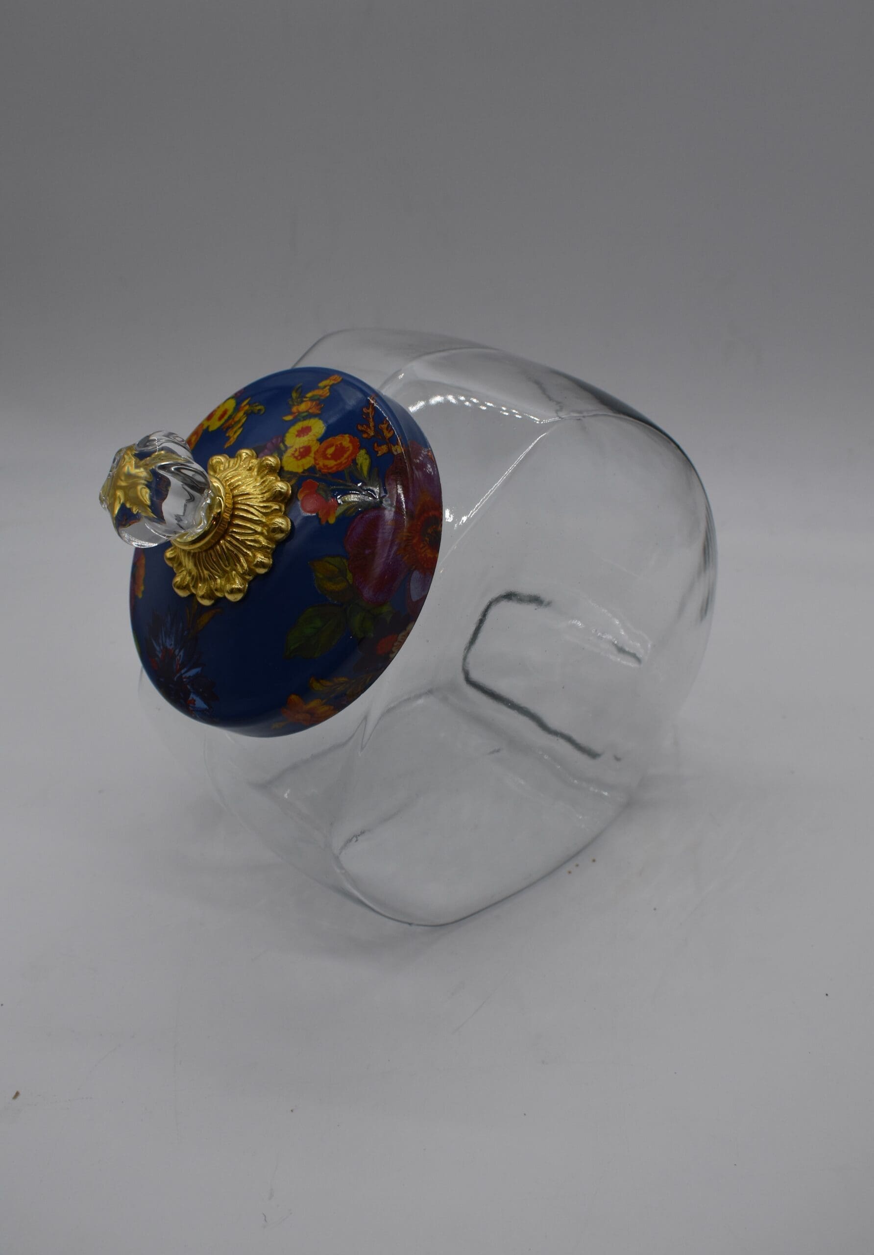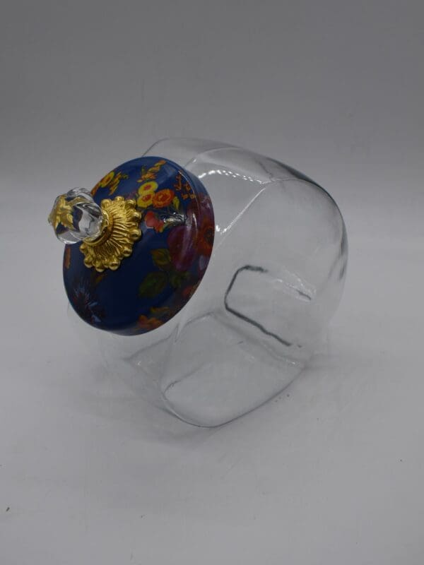 Glass jar; lid has heavy-gauge, hand-glazed steel underbody with hand-applied floral transfers. Knob assembly includes brass bobeche and glass finial. Pieces may vary due to the handmade nature of each product. Imported.