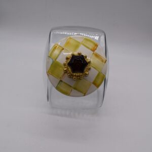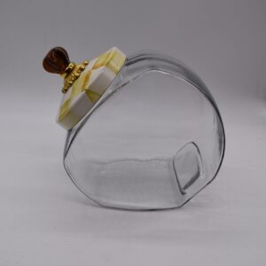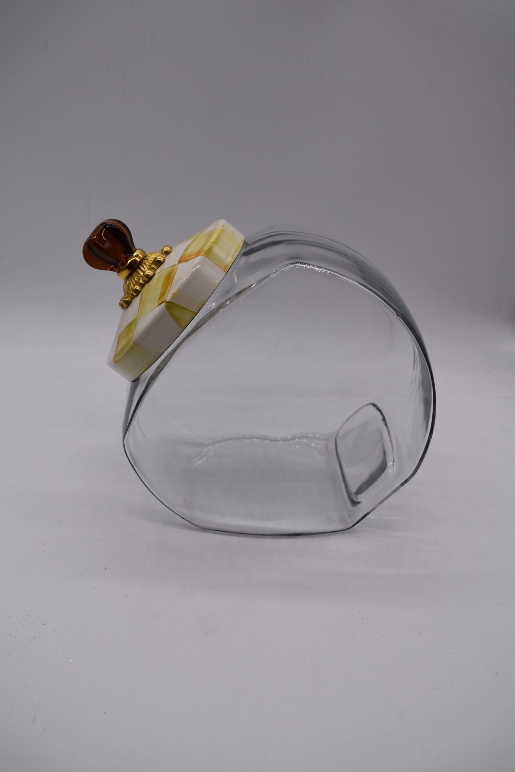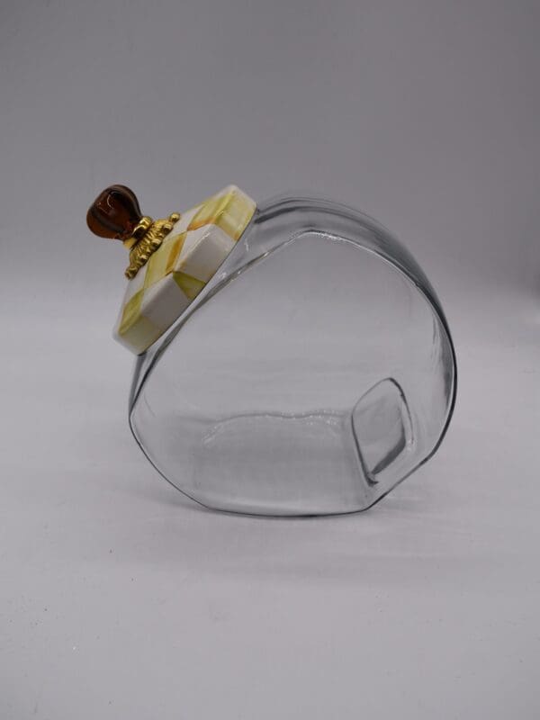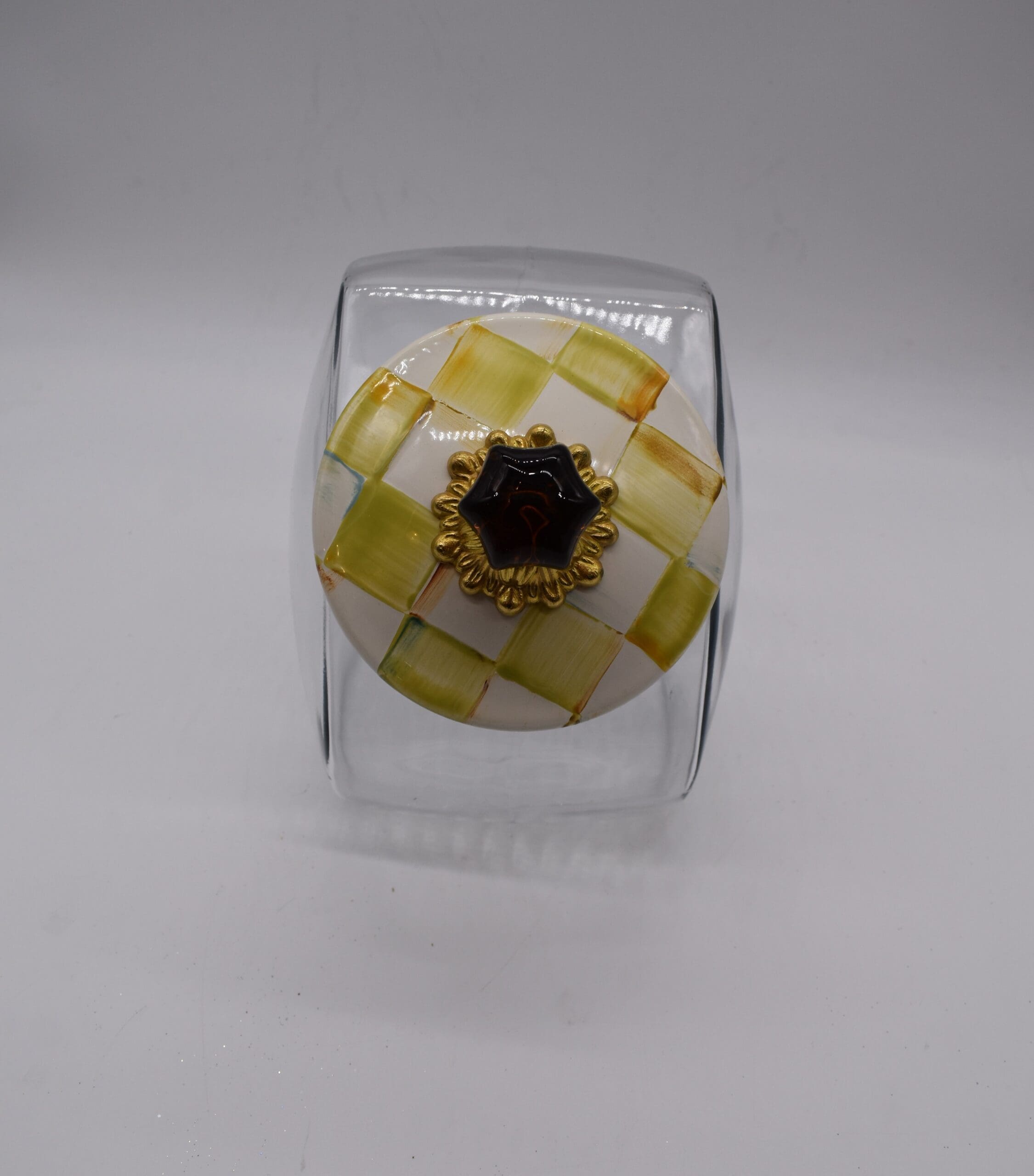 Glass jar; lid has heavy-gauge, hand-glazed steel underbody with hand-painted Parchment Checks, rimmed in bronzed stainless steel. Topped with an amber-colored glass knob and brass hardware. Pieces may vary due to the handmade nature of each product.