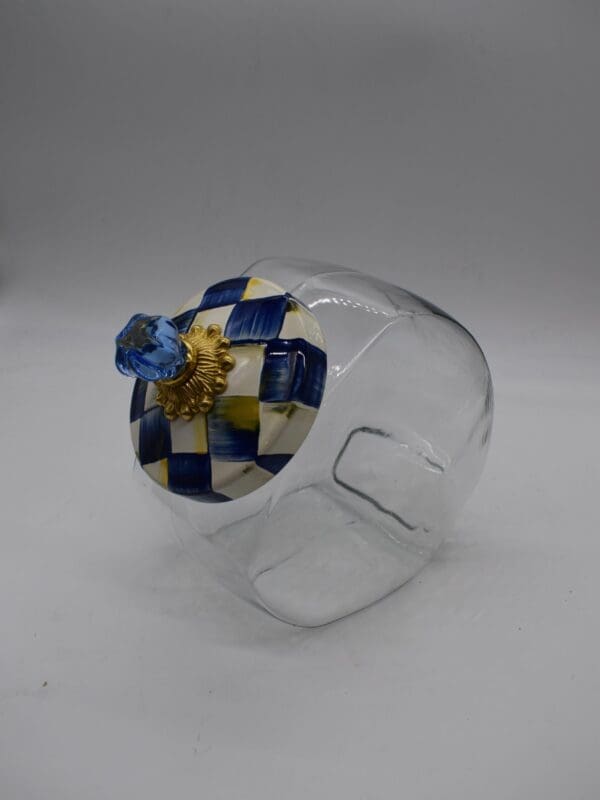 Glass jar, lid has heavy-gauge, hand-glazed steel underbody with hand-painted Royal Check decoration. Lid is topped with brass bobeche and glass finial. Pieces may vary due to the handmade nature of each product.