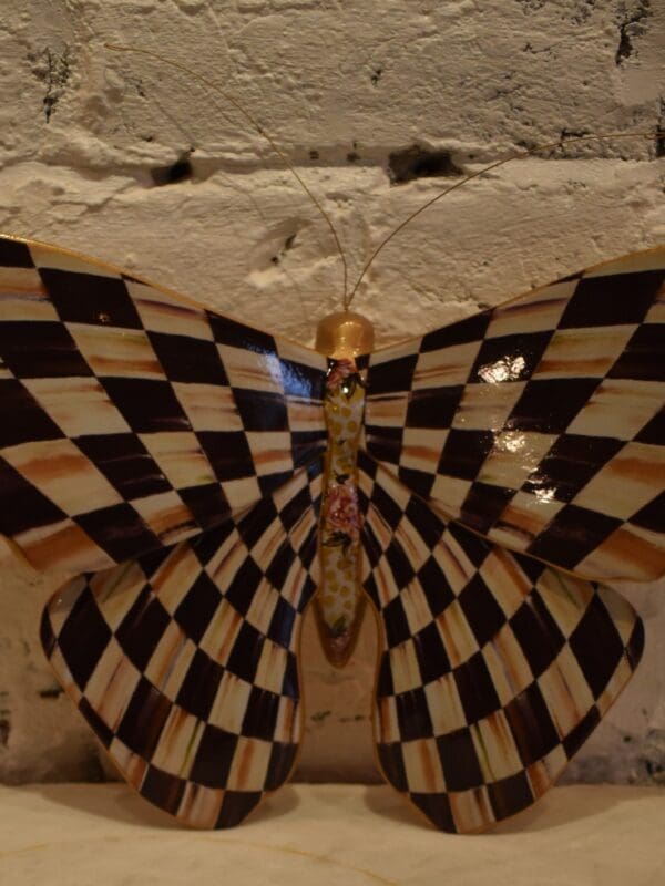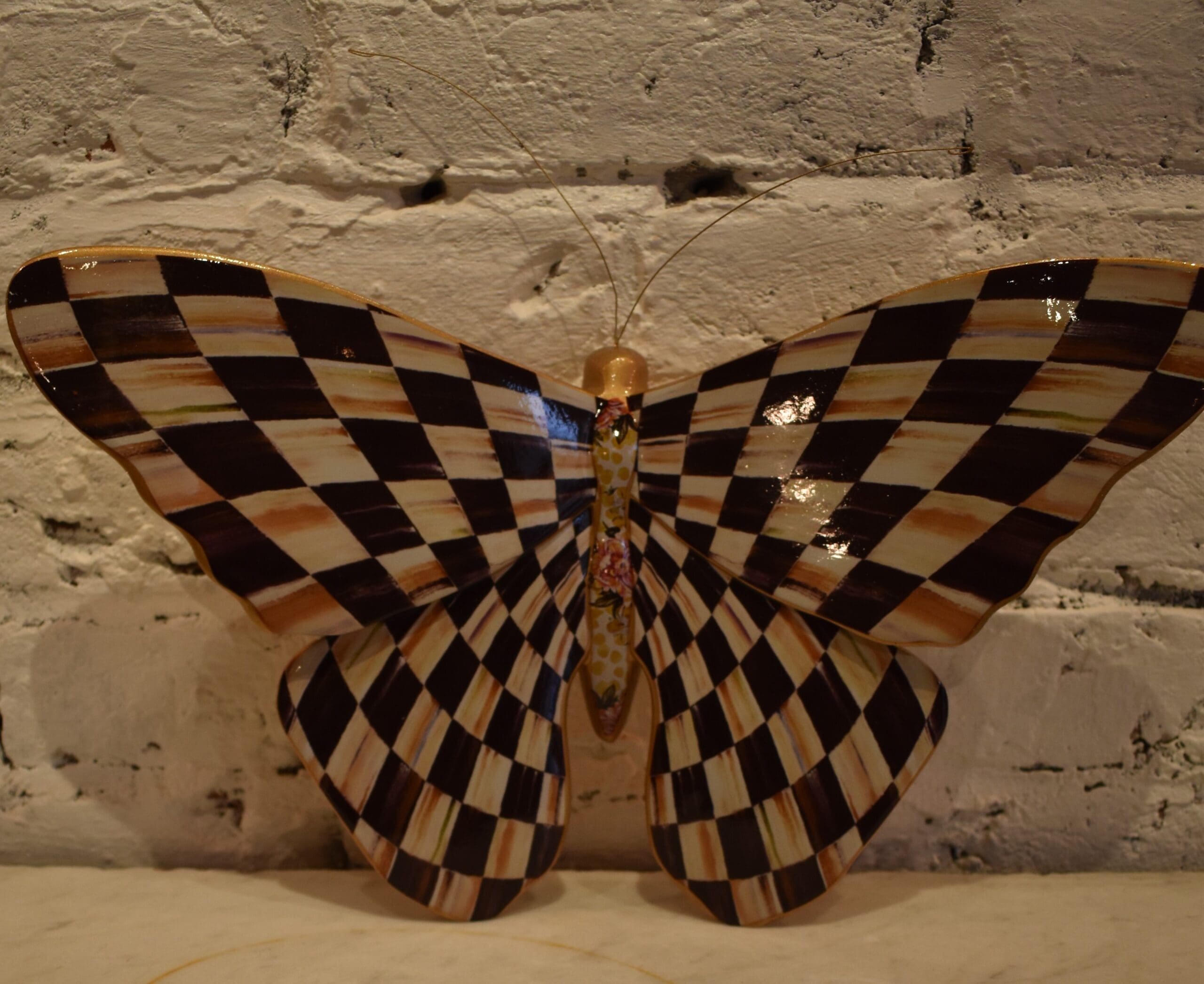 Our favorite dinnerware patterns take a flight of fancy. The Courtly Check® Butterfly features a transfer decoration of our signature checks on its gold-edged wings and more floral transfers on its body, topped with wire antennae. A keyhole hanger on the back allows the butterfly to attach securely to the wall. Arrange it solo or in a grouping with our other butterflies.
