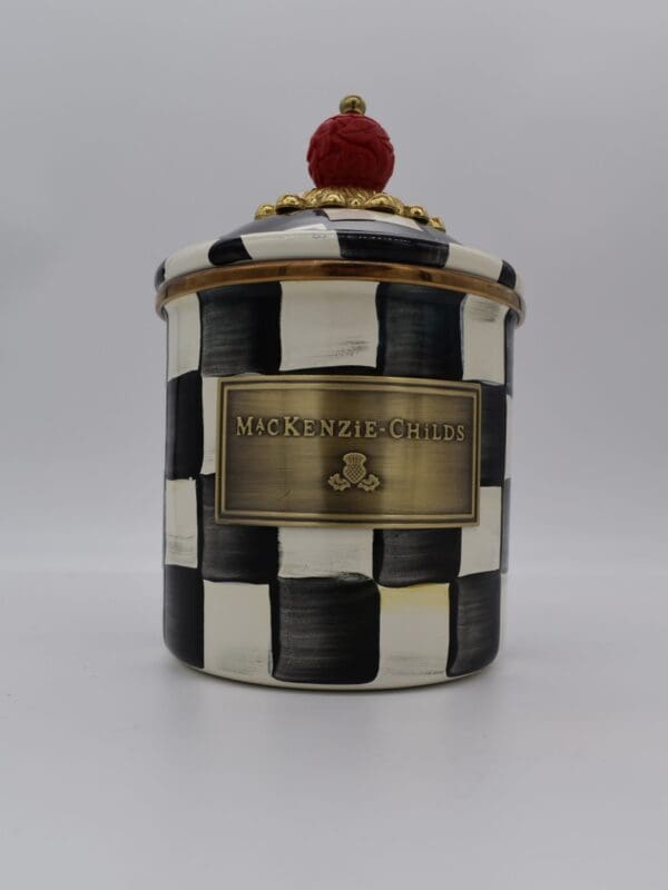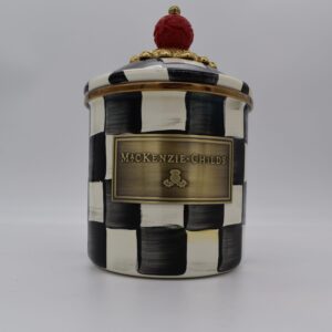 Add to the endless possibilities for our canisters with the Demi Courtly Check® Enamel Canister. A step up from our smallest sized canister, the Demi stands handsomely alone or harmonizes delightfully in a set. Keep it in the kitchen or invent new uses around the house. It’s perfect for cotton balls and swabs in the bathroom, pens and pencils in the office, or knickknacks and doodads in the kids’ room. Each enameled steel canister is hand-painted with black and white Courtly Checks® and topped with a faux cinnabar bead knob.