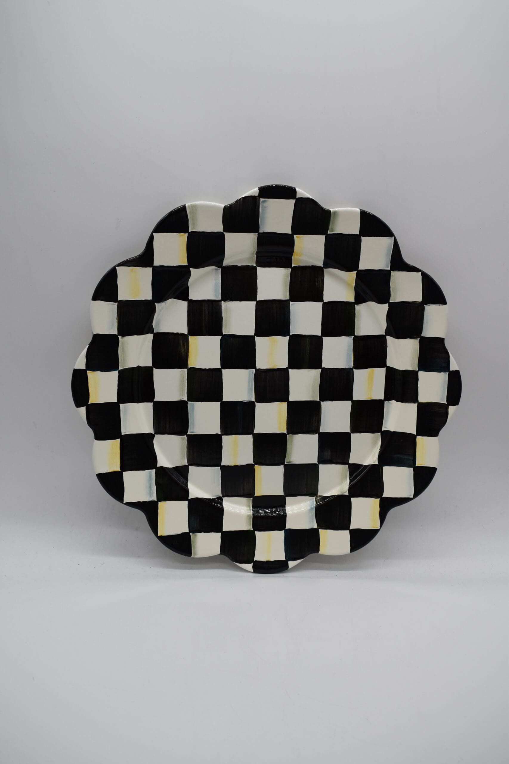Heavy-gauge, hand-glazed steel with hand-painted Courtly Check decoration and rolled edge. Pieces may vary due to the handmade nature of each product. Imported.