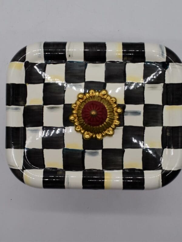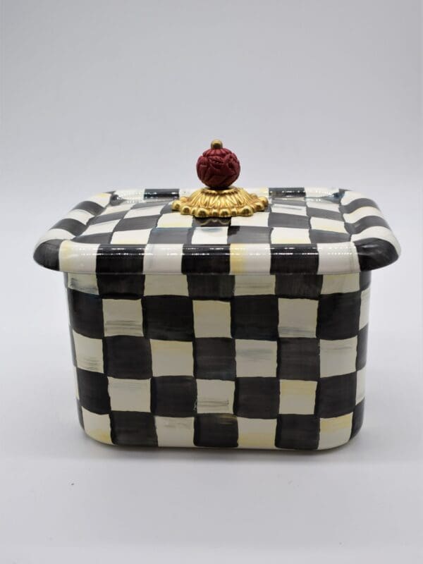 Hand-glazed, heavy-gauge steel underbody with hand-painted Courtly Check decoration, faux cinnabar, and brass accents. Includes set of recipe cards and recipe card dividers. Pieces may vary due to the handmade nature of each product. Imported.
