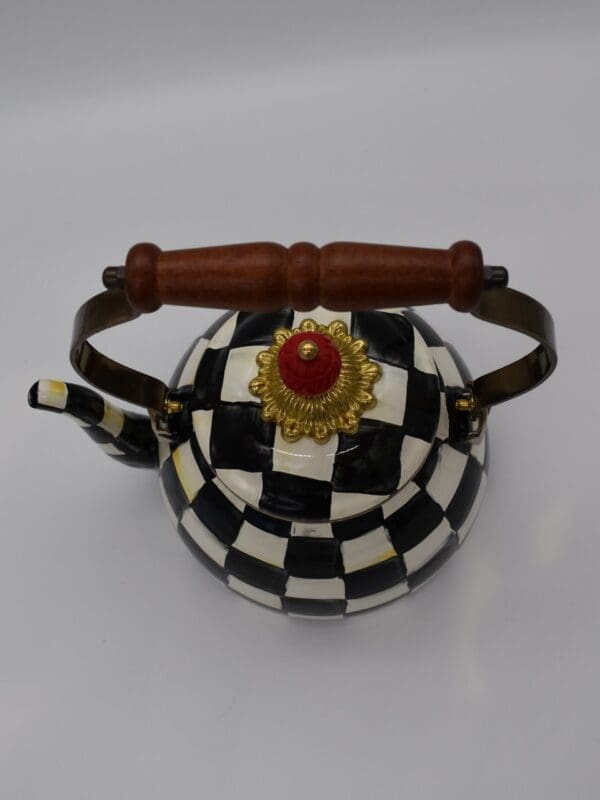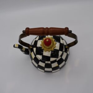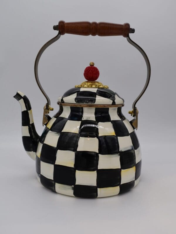 Our famed black and white checked tea kettle. Bubbling over with MacKenzie-Childs style, our Courtly Check® Enamel 2-Quart Tea Kettle will have you finding new reasons to put the kettle on to boil. The heavy-gauge steel underbody is hand-painted with our color-dragged Courtly Checks® and ceramic glaze, and rimmed in bronzed stainless steel. With a wood handle, and a lid topped with a carved faux-cinnabar bead, you may find yourself leaving this charming piece on the stovetop for kitchen beautification. Or place it on display, filled with fresh-cut flowers or greens. Our iconic MacKenzie-Childs kettle makes a perfect gift for seasoned collectors, or a welcome invitation for a friend new to our Courtly Check® wares.