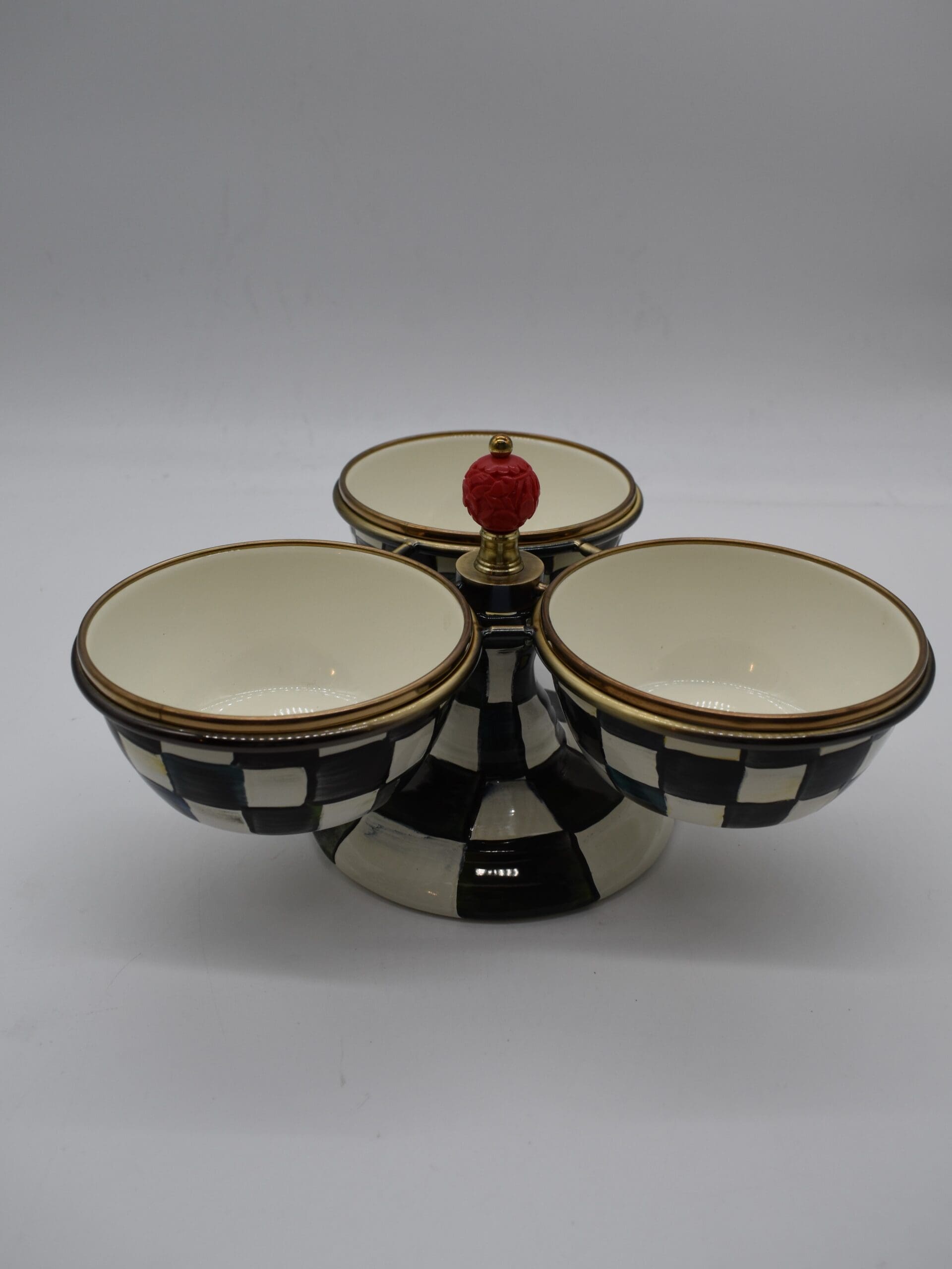 Heavy-gauge, hand-glazed steel underbody with hand-painted Courtly Checks, rimmed in bronzed stainless steel and iron. Brass and faux cinnabar accents. Pieces may vary due to the handmade nature of each product. Imported.