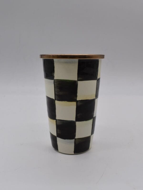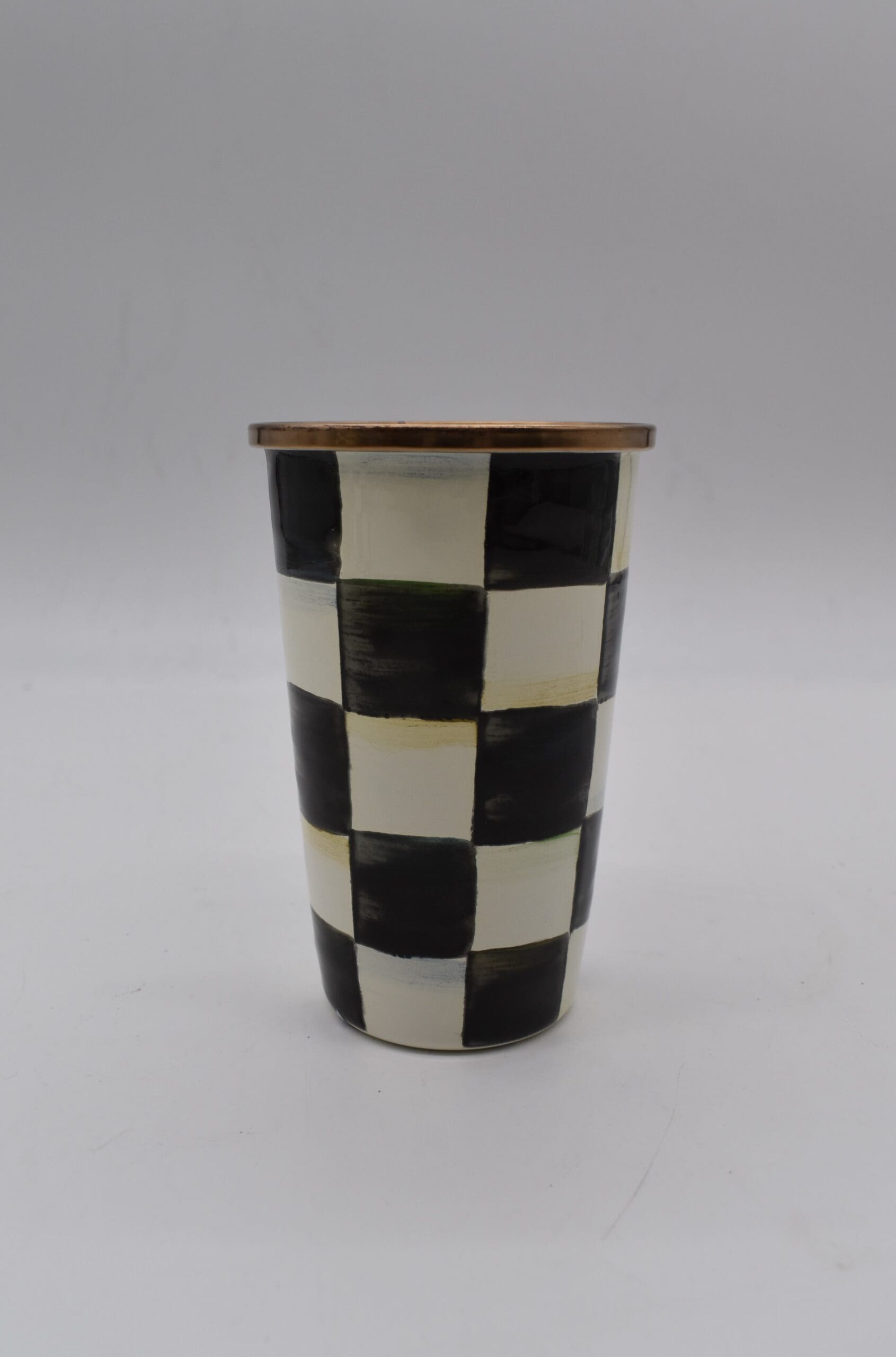 Heavy-gauge, hand-glazed steel underbody with hand-painted Courtly Checks, rimmed in bronzed stainless steel. Pieces may vary due to the handmade nature of each product. Imported.
