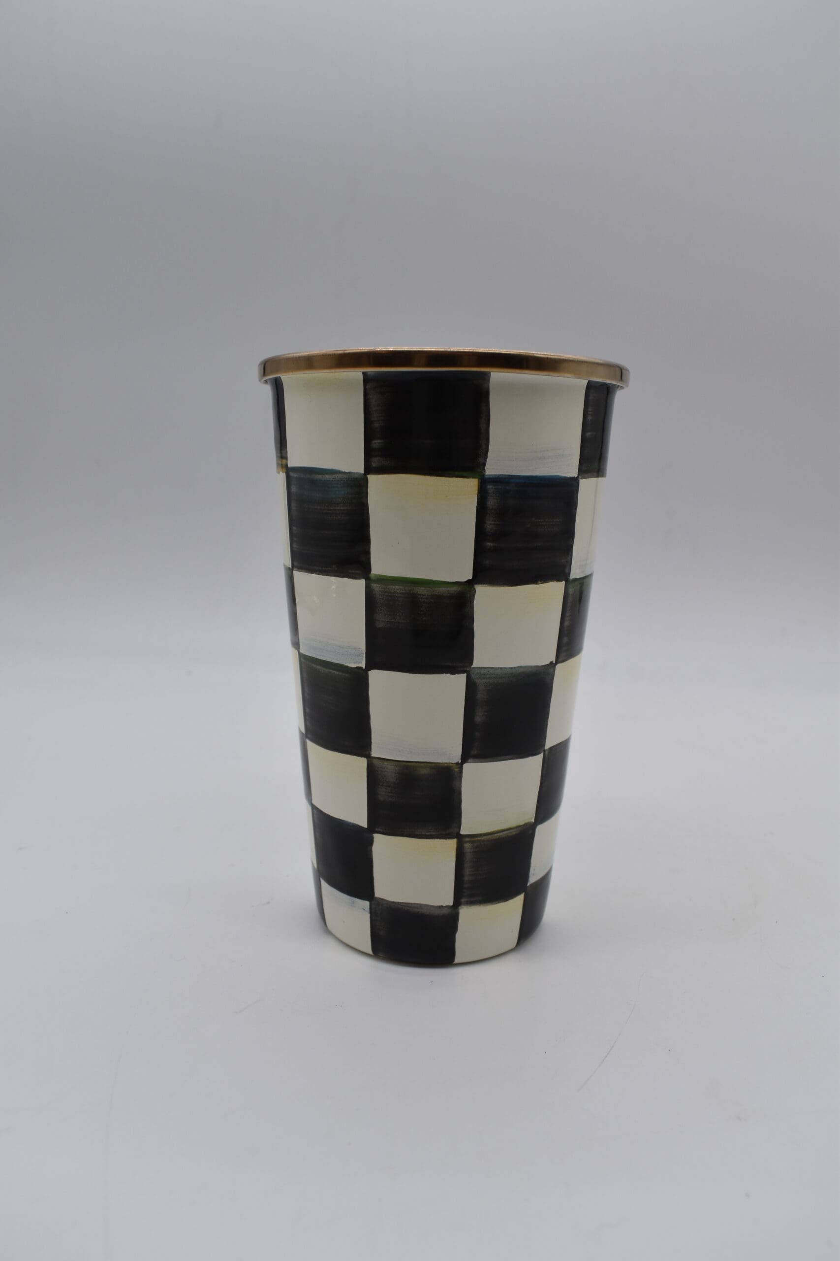 Heavy-gauge, hand-glazed steel underbody with hand-painted Courtly Checks, rimmed in bronzed stainless steel. Pieces may vary due to the handmade nature of each product. Imported.