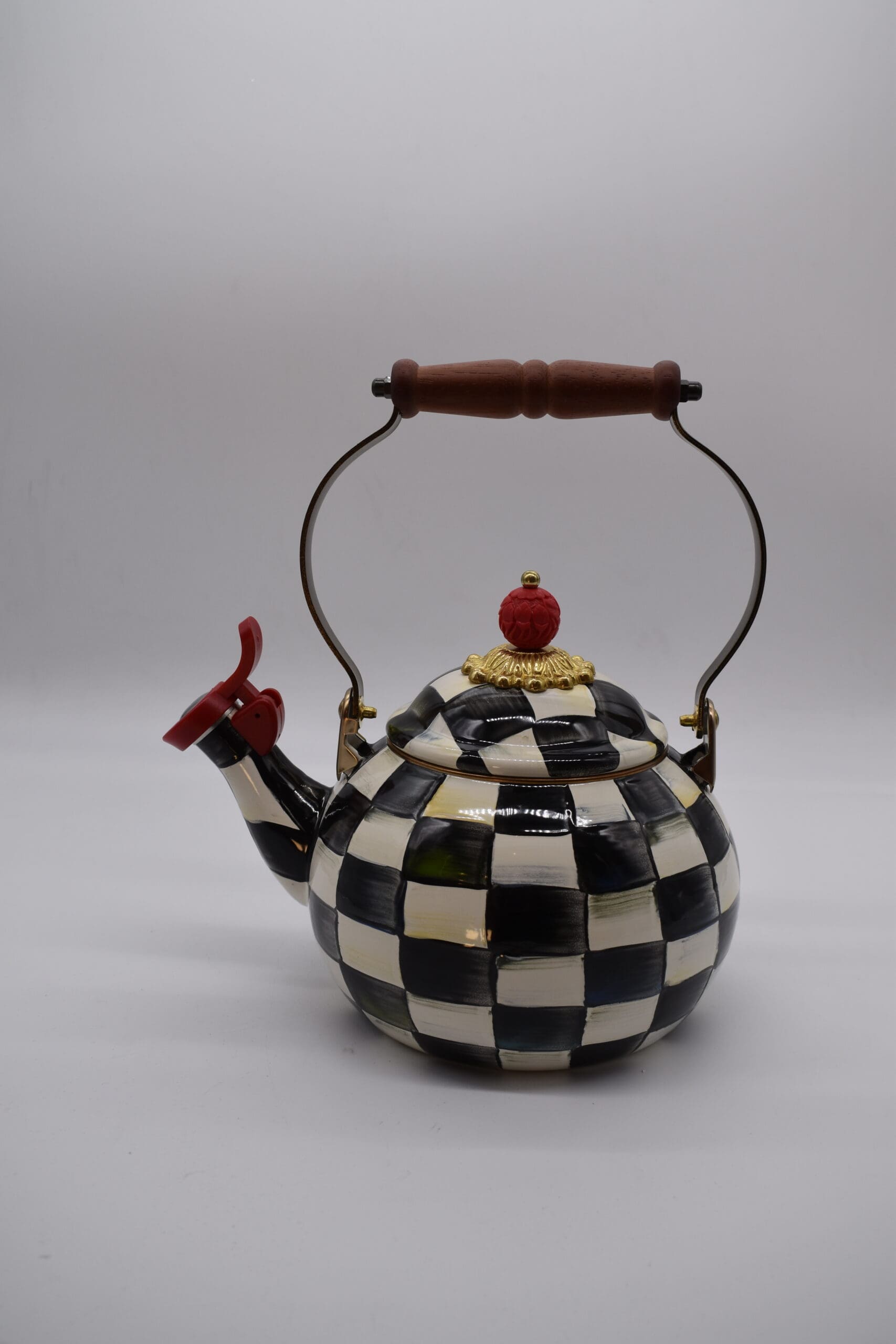 Whistling while it works, the Courtly Check® Enamel Whistling Tea Kettle lets you know when your water is ready. So pour yourself a cup of tea or fire up the French press, because when you hear that pretty sound, you know your day is about to get a little bit better. Hand-painted with our signature black and white checks over a heavy-gauge steel underbody, it also serves to beautify your stovetop even when it’s not in use.