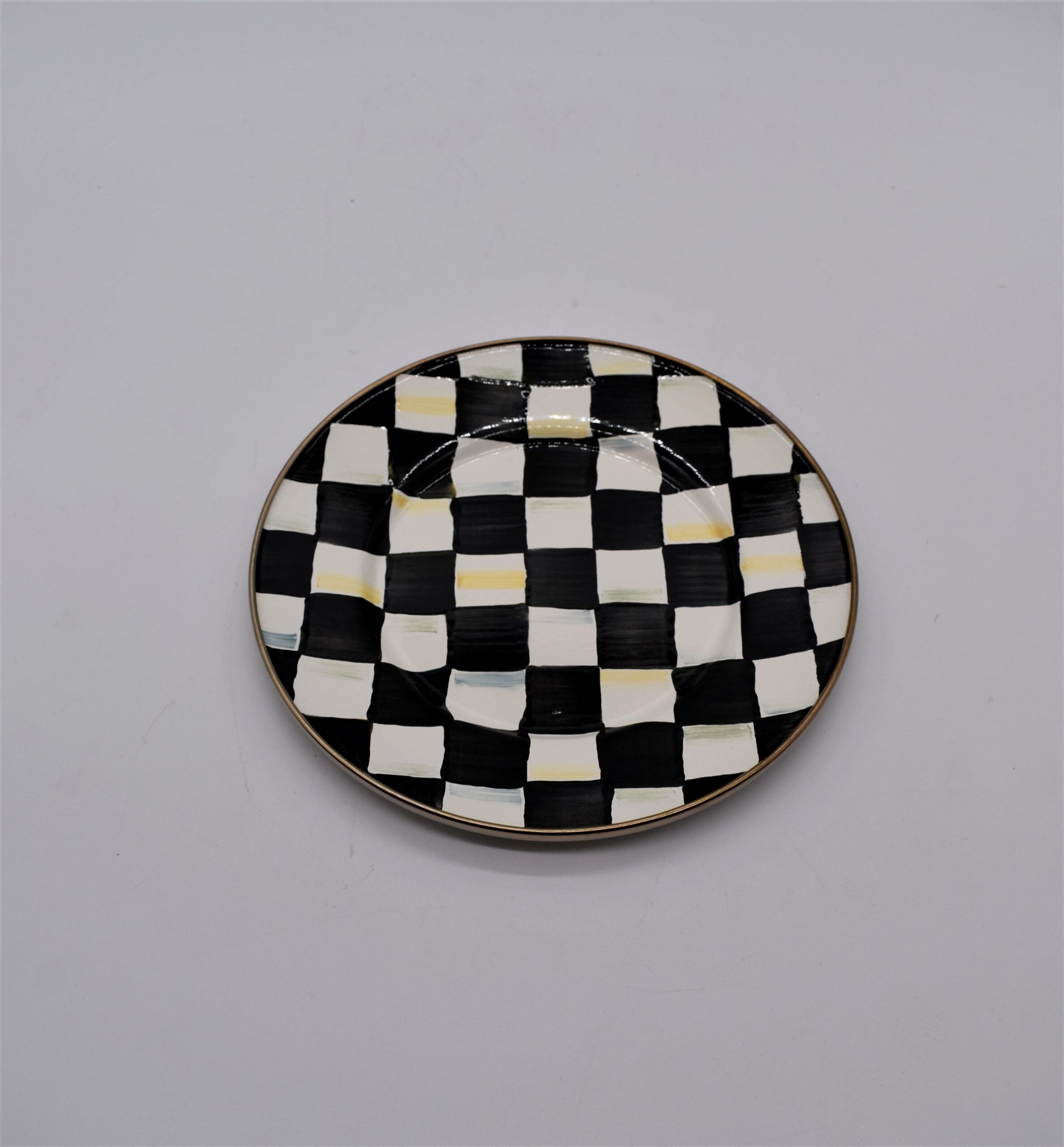 Heavy-gauge, hand-glazed steel underbody with hand-painted Courtly Checks, rimmed in bronzed stainless steel. Pieces may vary due to the handmade nature of each product. Imported.