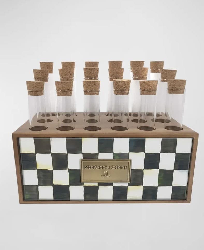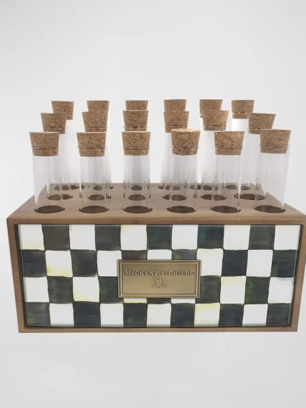 Wood base with hand-painted Courtly Checks enamel plate. Includes set of 20 glass vials with cork stoppers. Pieces may vary due to the handmade nature of each product. Imported.