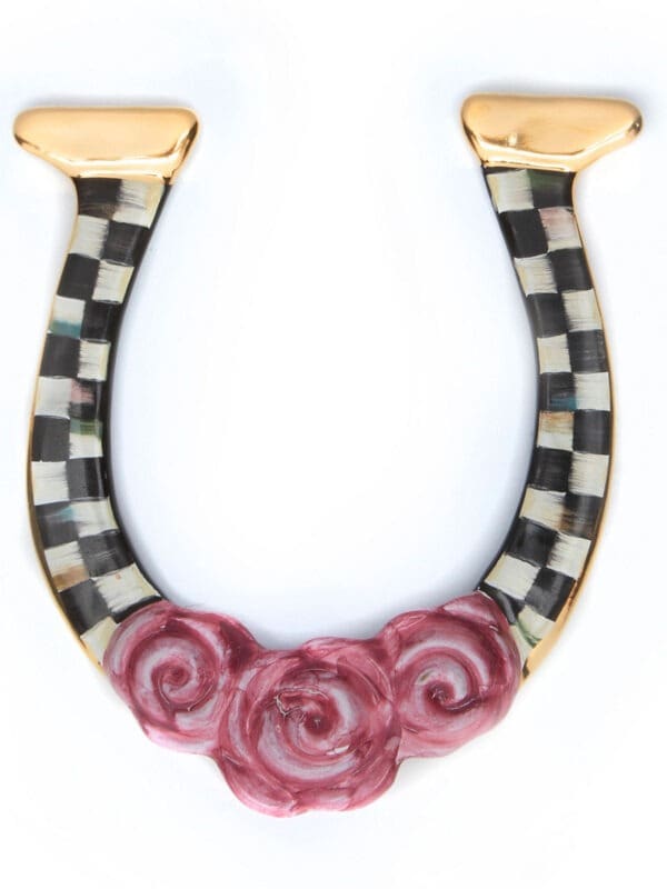 Win, place, or show, good luck will always be yours with our exclusive, limited-edition Courtly Horseshoe. Made start to finish by our artisans in Aurora, New York, it features our signature color-dragged check pattern, decorated with gold lustre at the top and a trio of molded pink roses at the bottom. Thanks to hanging holes on the back, your horseshoe will always face up, catching the luck dropped into it from above. Available for a limited time only.