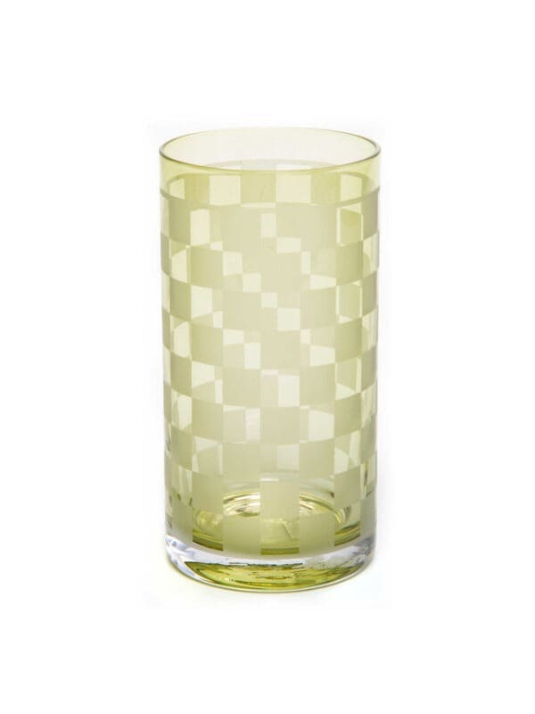 The set of four Green Dashing Check Highball Glasses is a dashing addition to your bar. Made of cased glass, which is composed of green glass sandwiched between layers of clear glass, these sleek glasses are decorated with hand-applied check transfers.