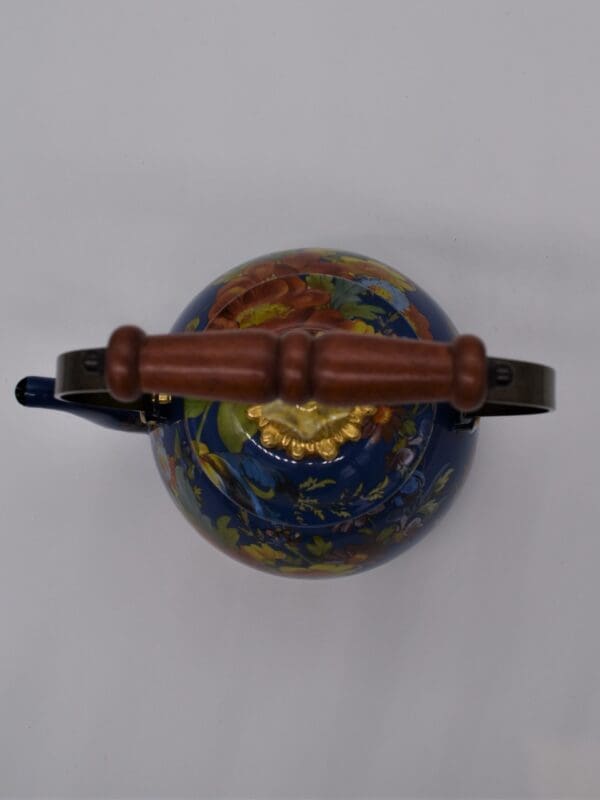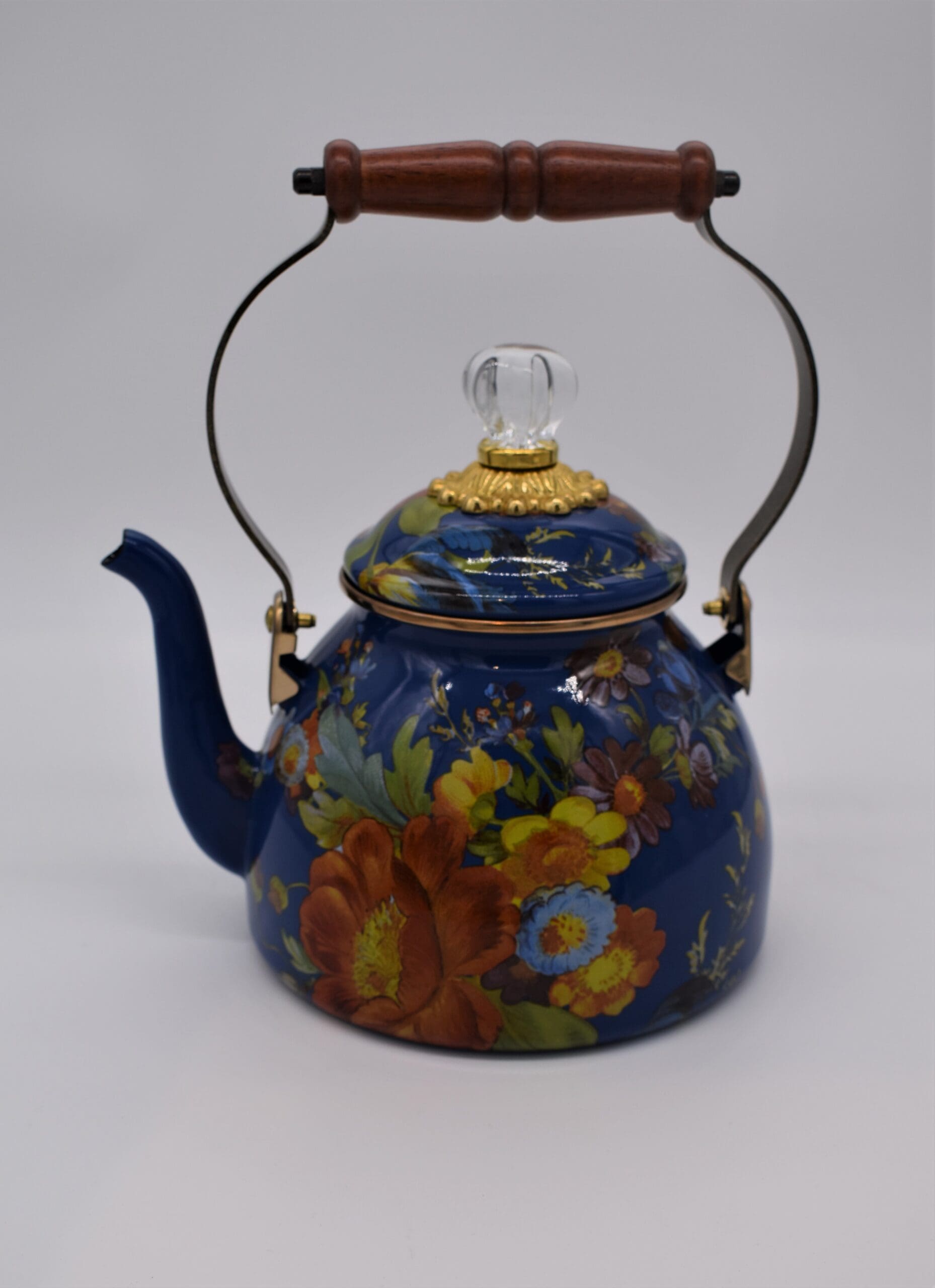 Bubbling over with MacKenzie-Childs style, our Lapis Flower Market 2 Quart Tea Kettle will have you finding new reasons to put the kettle on to boil. The heavy-gauge steel underbody is glazed with a deep blue, hand decorated with fanciful botanical transfers, and rimmed in bronzed stainless steel. It also features a wood handle and a lid topped with a clear glass knob. Gorgeous filled with fresh-cut flowers or greens, too.