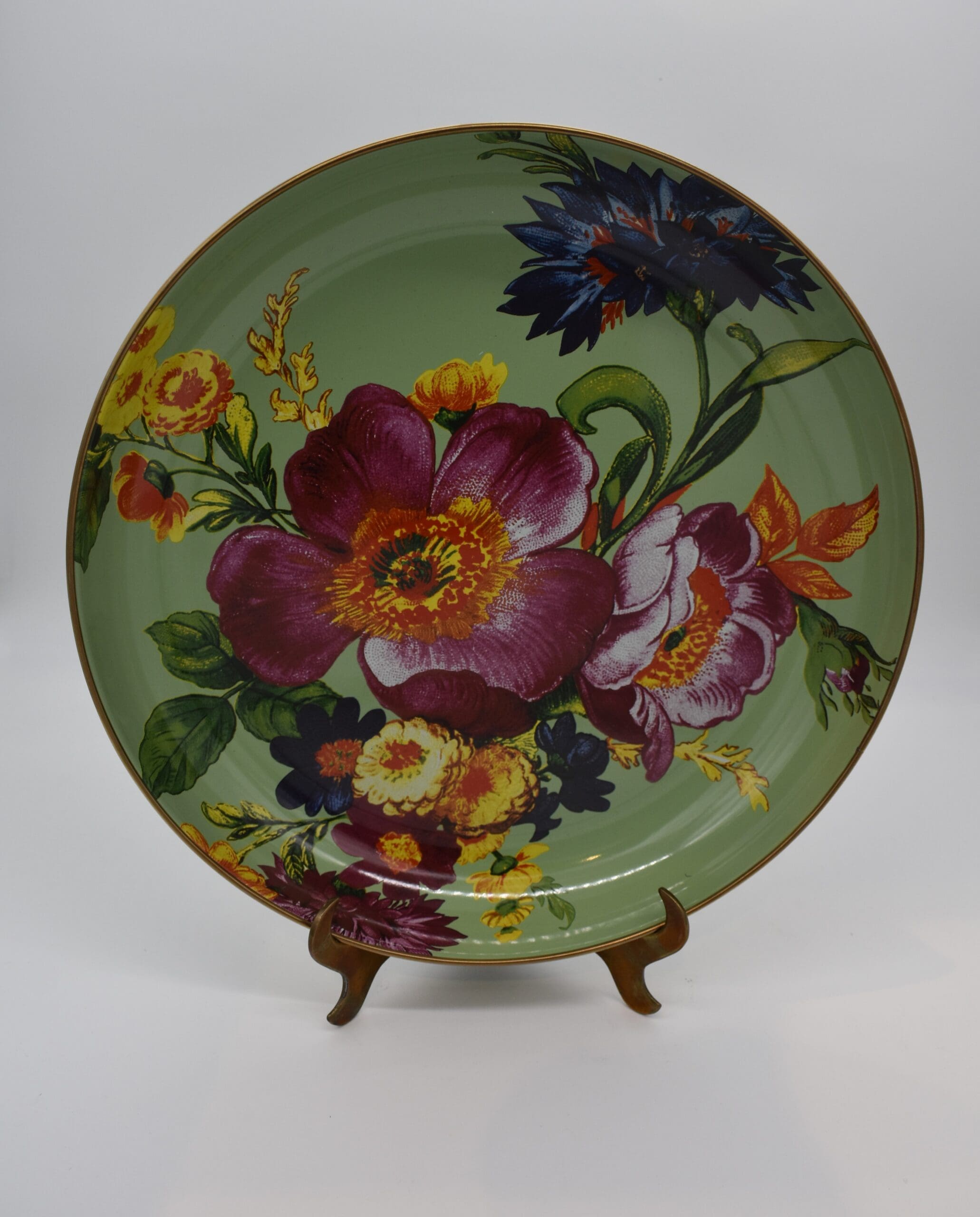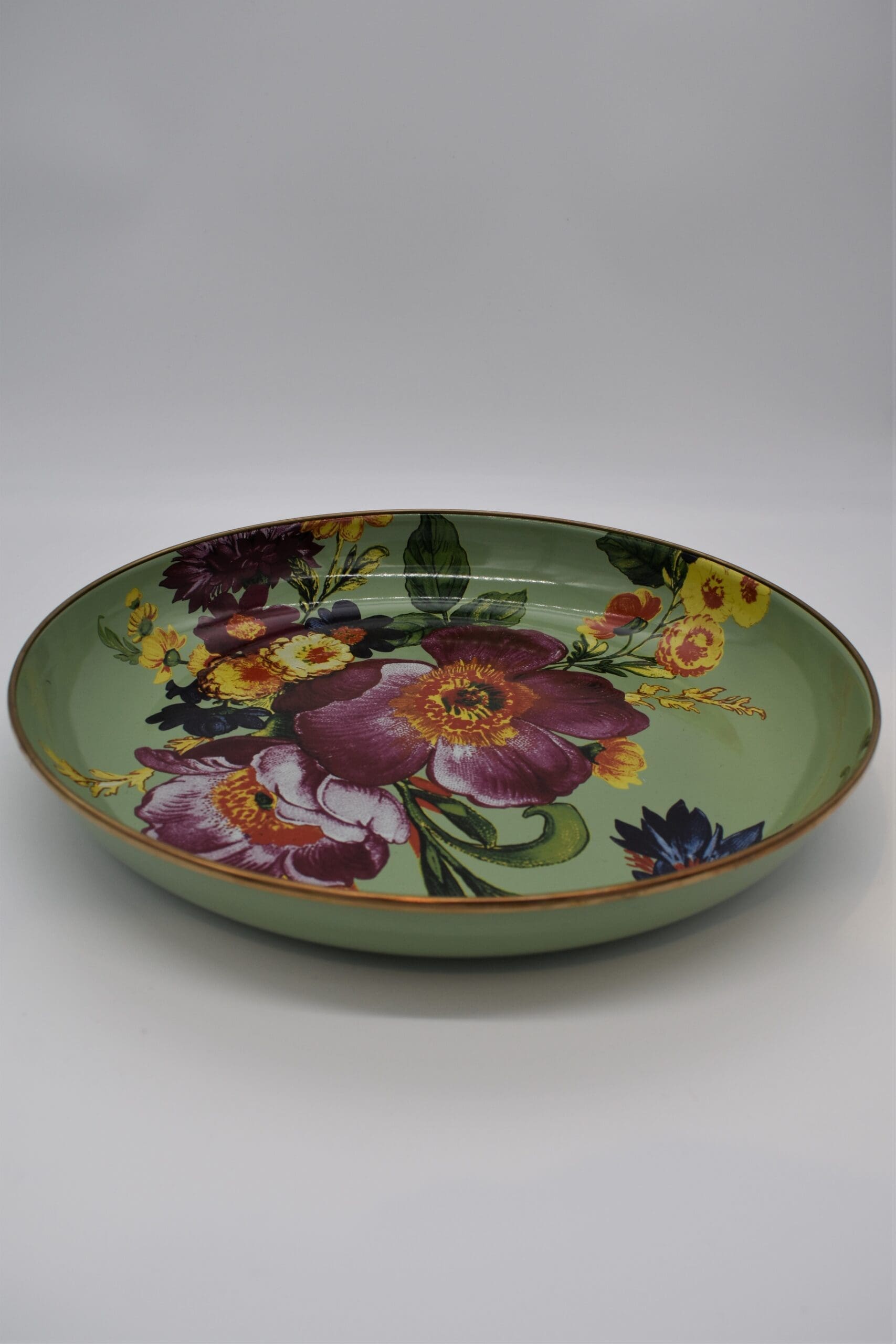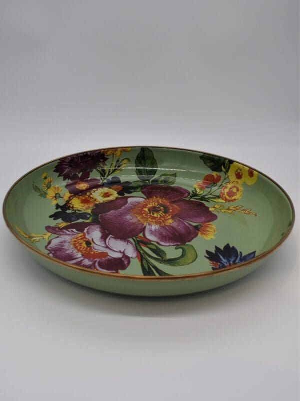 Add a versatile do-it-all piece to your kitchen and table. The Green Flower Market Abundant Bowl handles serving in style. Its upturned edge is especially handy for presenting main courses that have a bit more sauce, like a heaping bowl of pasta. Heavy-gauge, hand-glazed steel underbody with hand-applied transfer floral pattern and a bronzed stainless-steel rim.