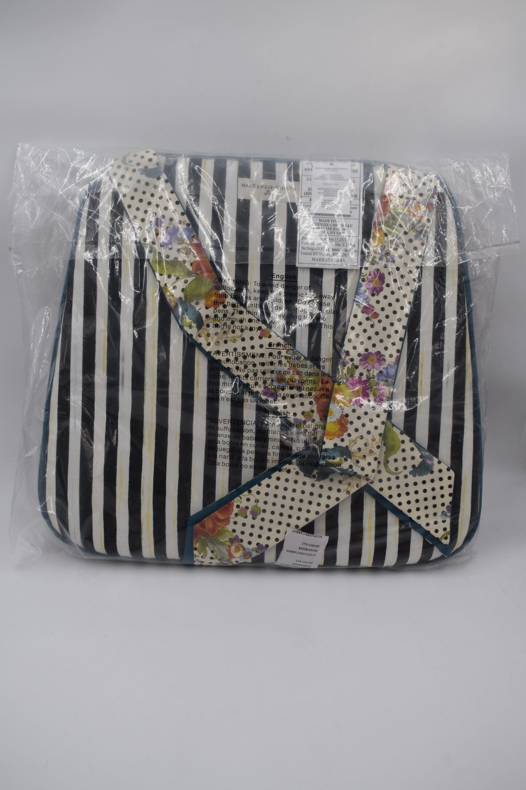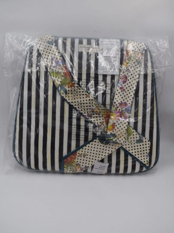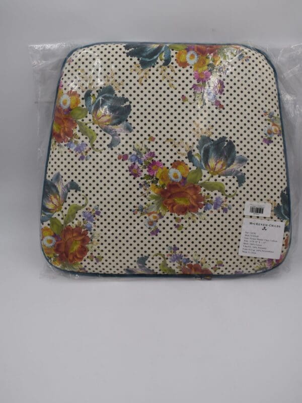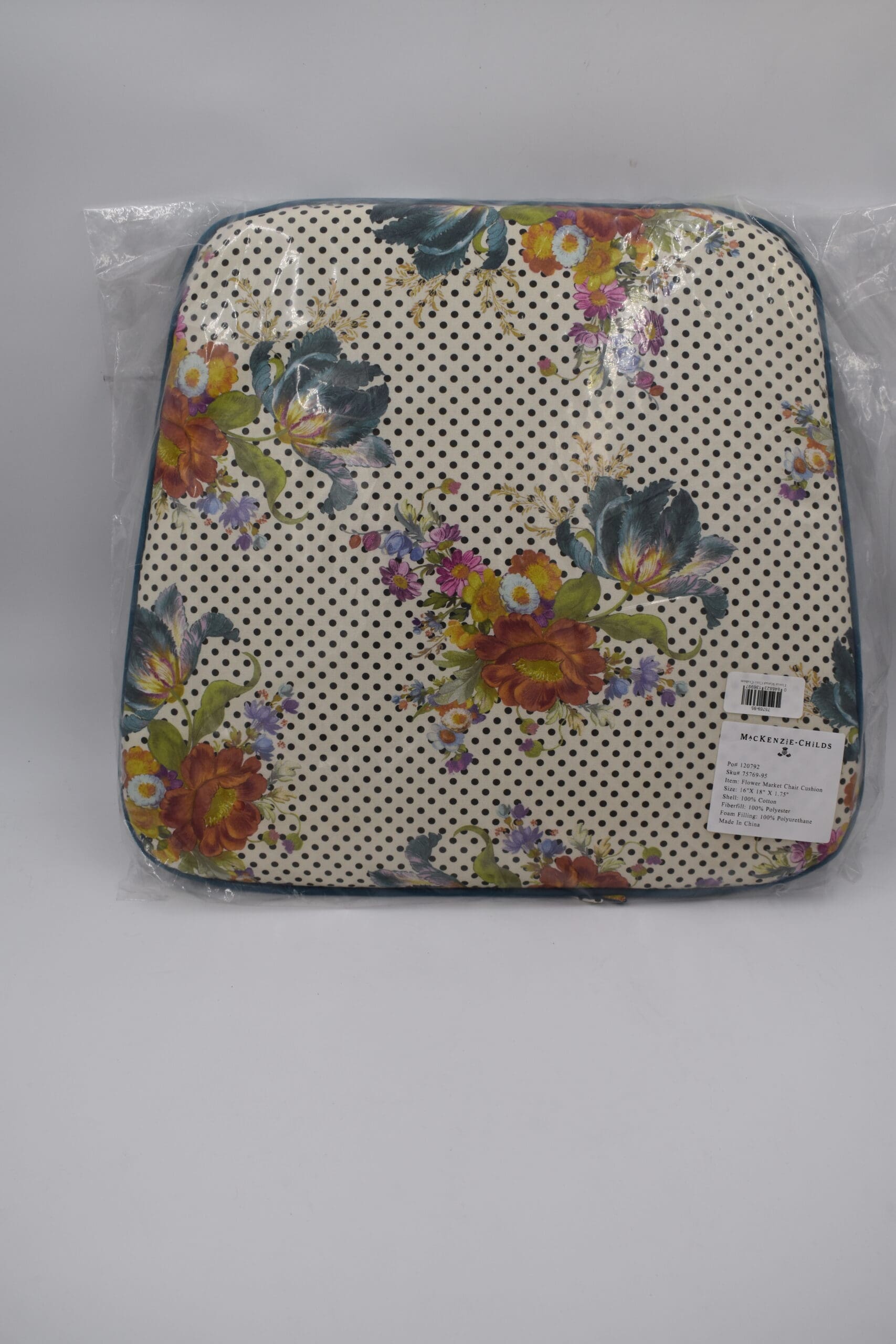 Turn every dining chair into the best seat in the house with our Flower Market Chair Cushion. Featuring a perfectly balanced combination of comfort and style, this posh pad is a print of our Flower Market dinnerware patterns on a background of black polka dots and fitted with matching ties. Courtly Stripe fabric is on the reverse side.