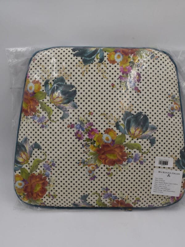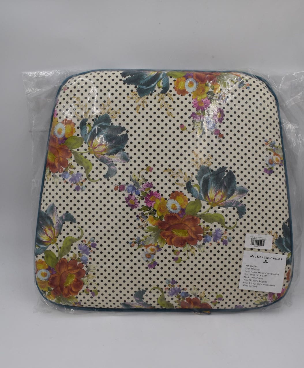 Turn every dining chair into the best seat in the house with our Flower Market Chair Cushion. Featuring a perfectly balanced combination of comfort and style, this posh pad is a print of our Flower Market dinnerware patterns on a background of black polka dots and fitted with matching ties. Courtly Stripe fabric is on the reverse side.