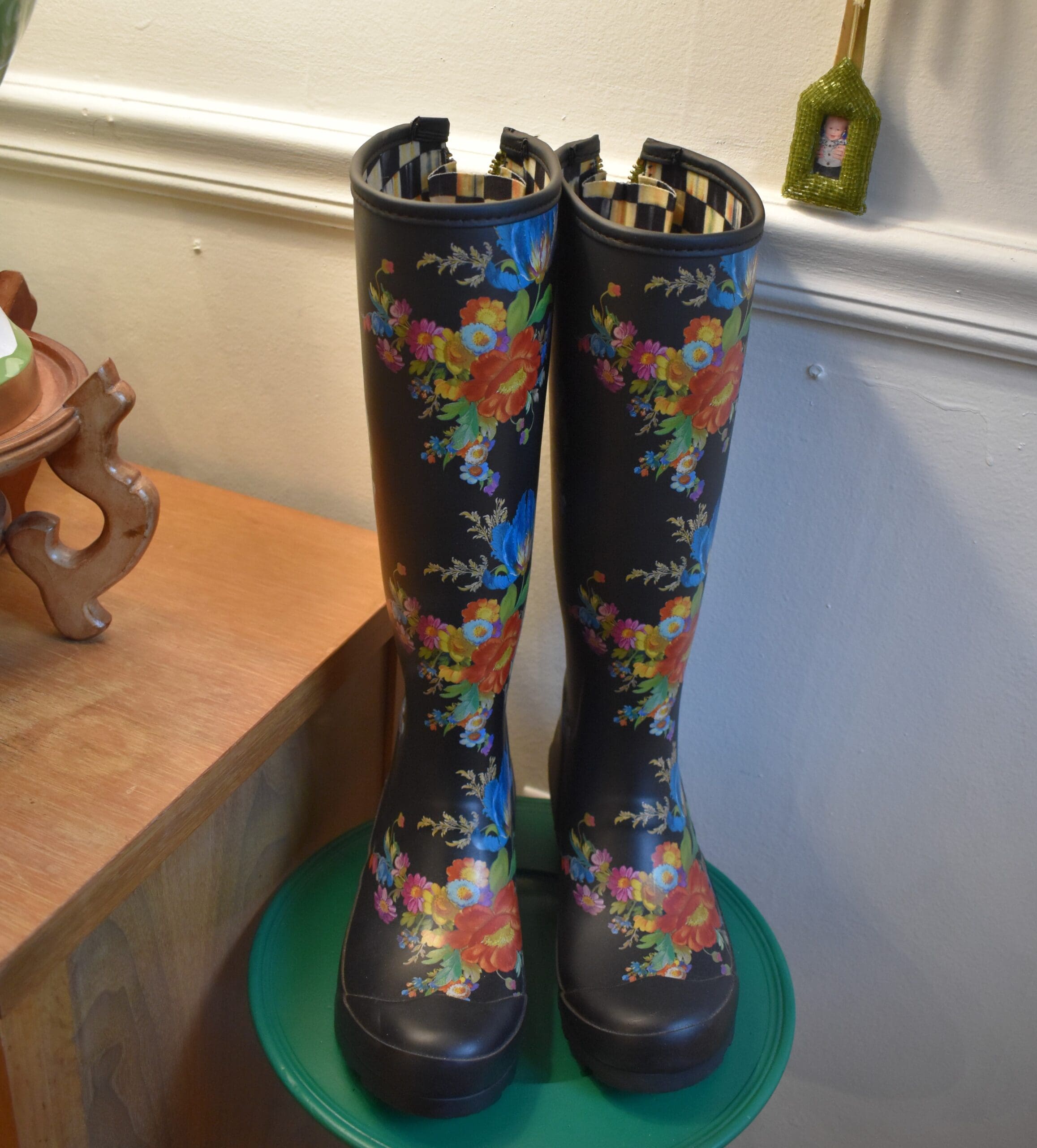 Adventure awaits, whether you’re in the garden or on the go, traveling all kinds of terrains. With our Tall Flower Market Rain Boots, you’ll kick up your heels in style. They’re the perfect pairing of fashion and function and are decorated with our Courtly Stripe and Black Flower Market patterns on the outside and our Courtly Check® on the inside. Made of premium rubber with slip-resistant soles and a moisture-wicking lining, they easily pull on and off, thanks to a sturdy zipper on the back.