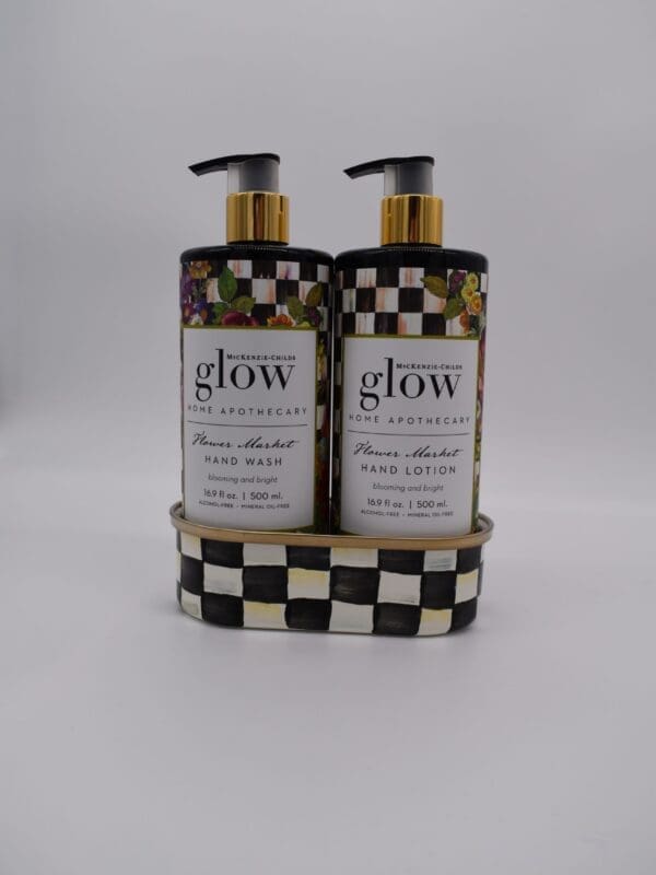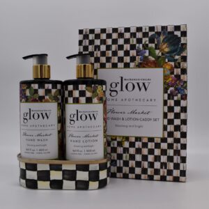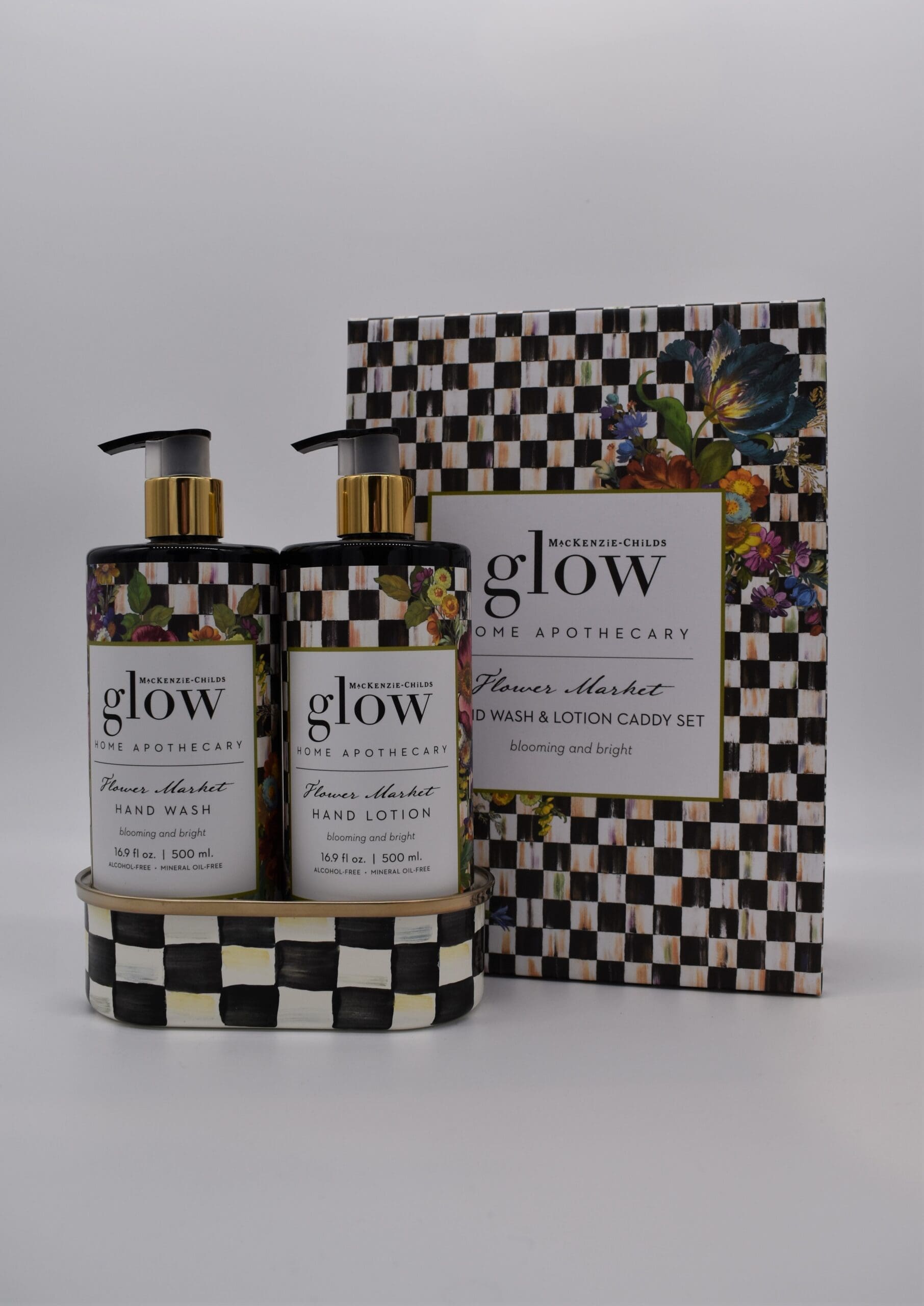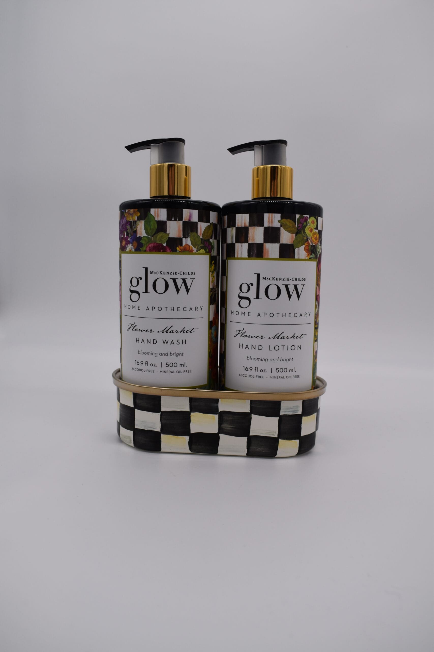 MacKenzie-Childs Glow Home Apothecary defines the essence of home with fresh and inviting scents. Our Flower Market Soap & Lotion Caddy Set includes our Flower Market Hand Wash and Flower Market Hand Lotion presented in a Courtly Check® enamel caddy. Each product, featuring a blooming and bright blend of market-fresh bouquets with light musk and woody notes, is formulated from natural ingredients that leave your hands clean and moisturized.