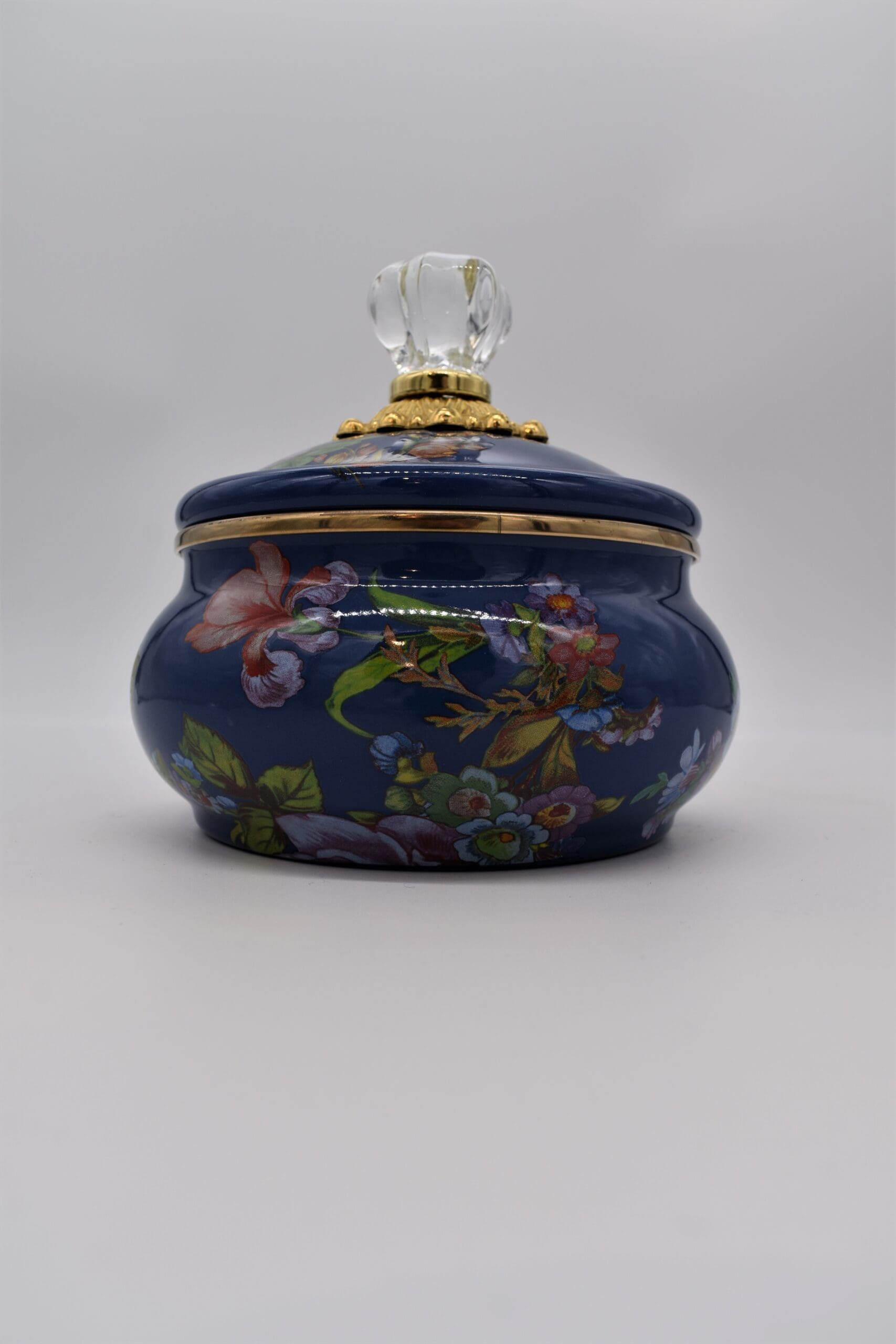 The shortest member of the canister family, our Lapis Flower Market Squashed Pot more than pulls its weight: This chubby silhouette holds an impressive 20 ounces. Its heavy-gauge steel underbody is color-glazed in deep blue, hand decorated with floral transfers, rimmed in bronzed stainless steel, and topped off with an elegant glass knob.