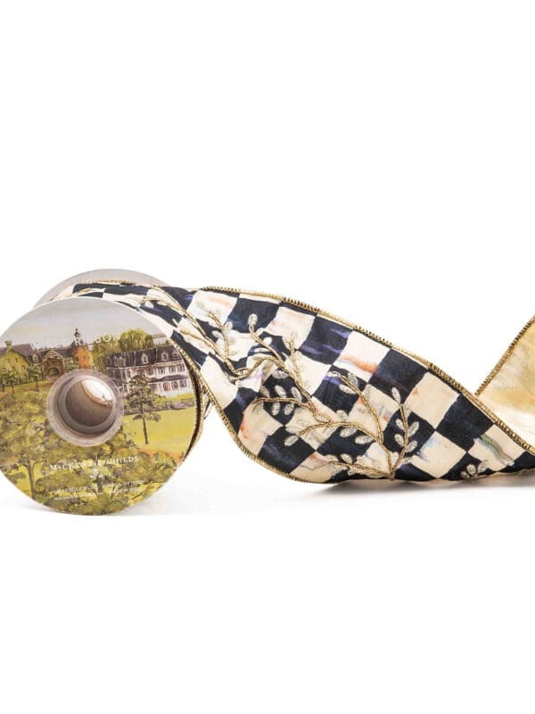 From trimming the tree to tying gift boxes, there’s no limit to the uses for this wired 4” Courtly Check® ribbon that’s embroidered with a silver and gold leaf pattern.