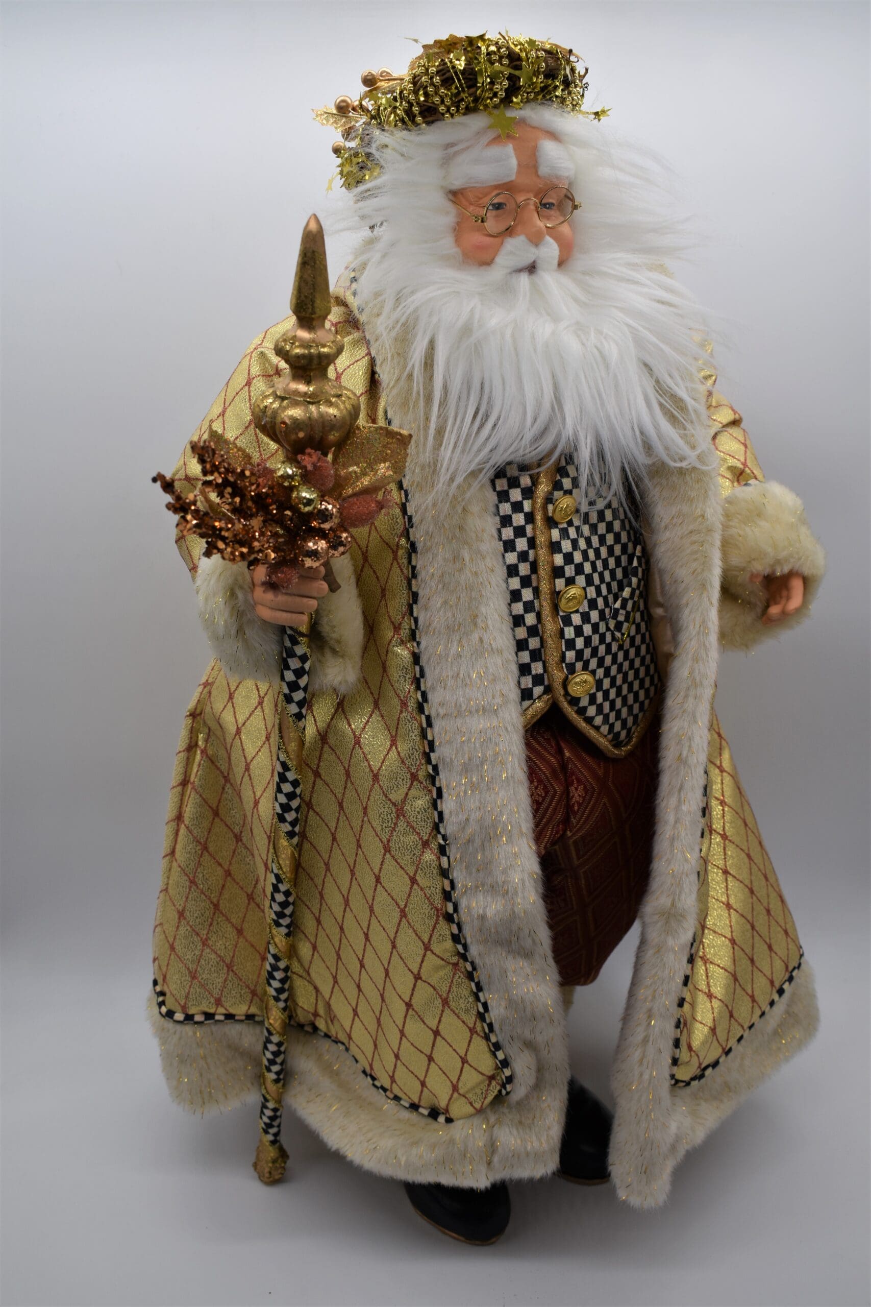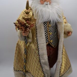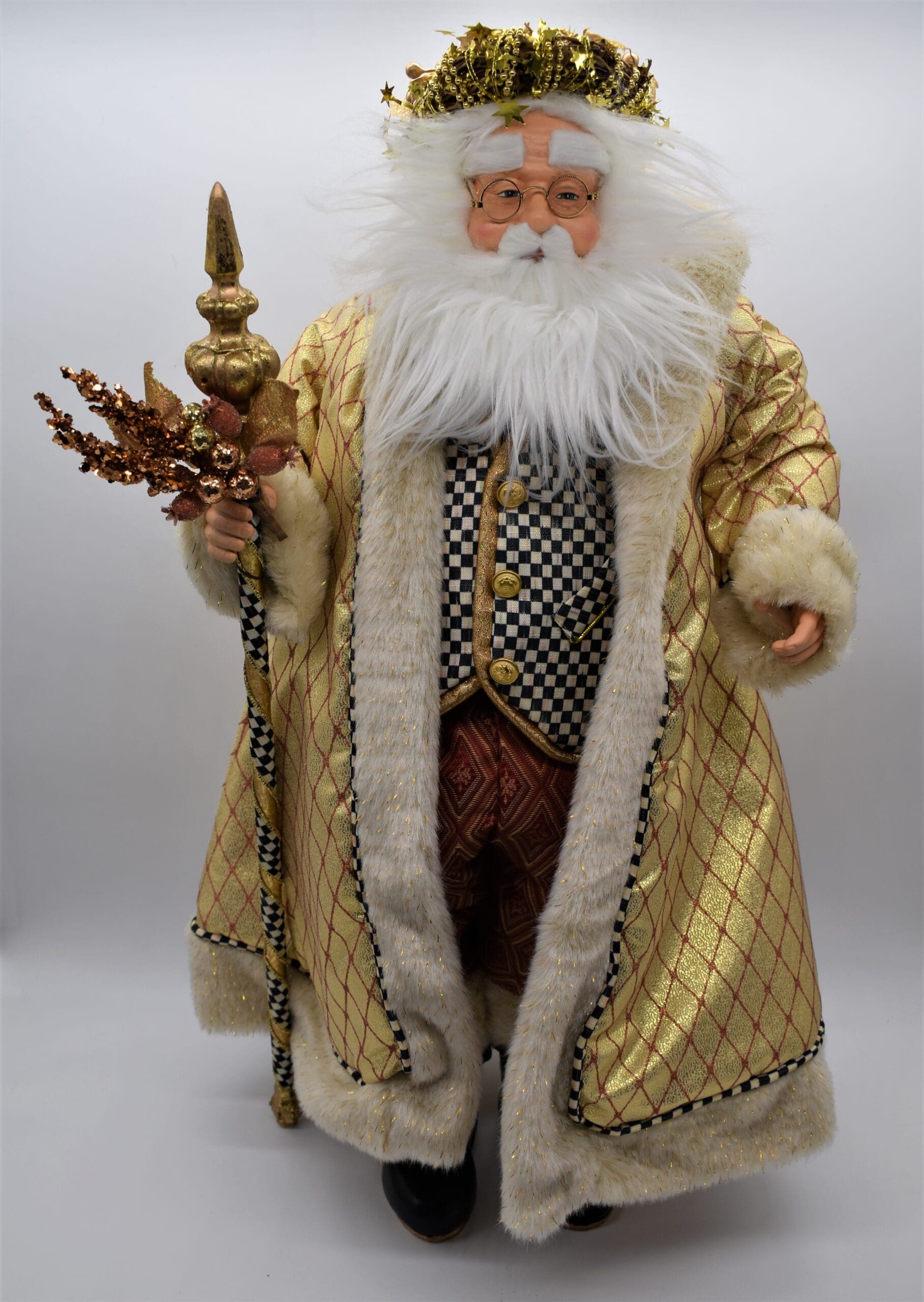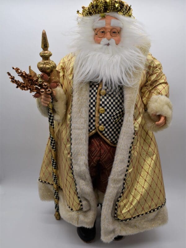Golden Hour Father Christmas with Staff is a handmade delight, brimming with delightful details. He wears a regal gold robe, trimmed with faux fur, and a Courtly Check® vest. Atop his head is a crown of gold leaves and berries, and he carries a golden staff. Place this special figure in a spot on a mantel or tablescape to get all the attention he deserves.