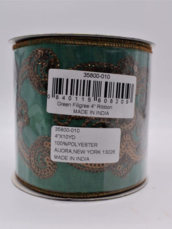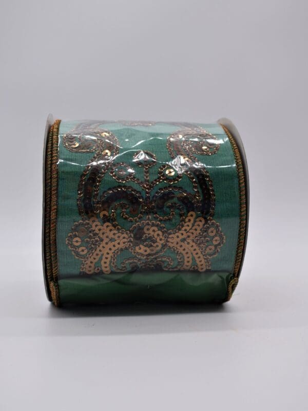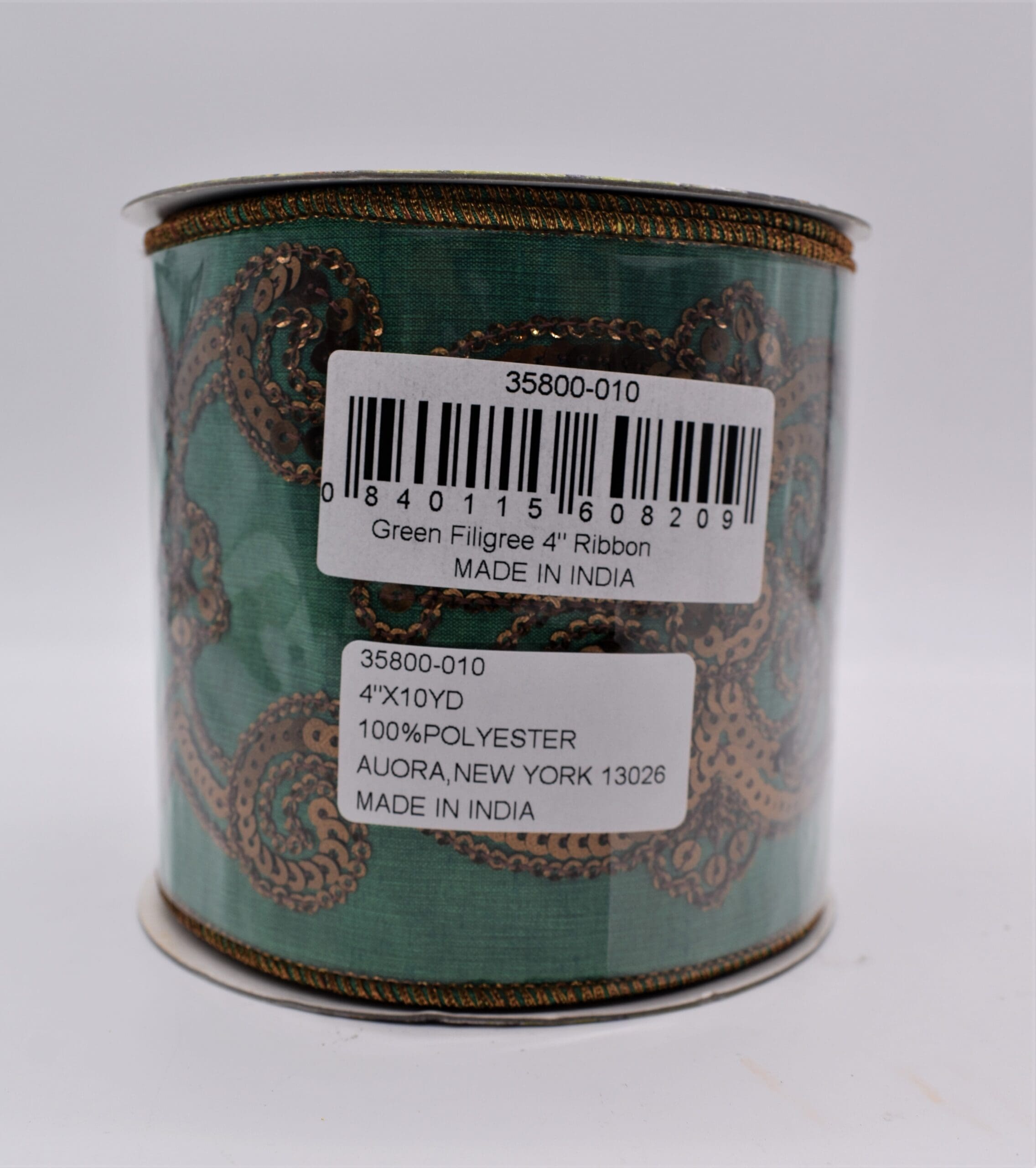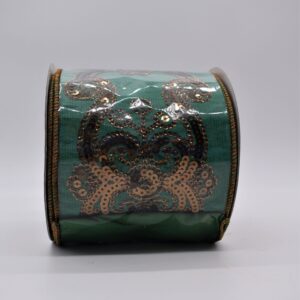 Wrap up the holidays with our 4″ Green Filigree Ribbon, which complements our Happy Holidays collection. Decorated with a scrolled pattern of sequins, this damask ribbon has wired edges for easy shaping, making it perfect to swirl around the tree or tie on a gift box. In fact, we’re so sure you’ll find no limit of uses year-round for this luxurious accent, you might want to buy more than one roll.
