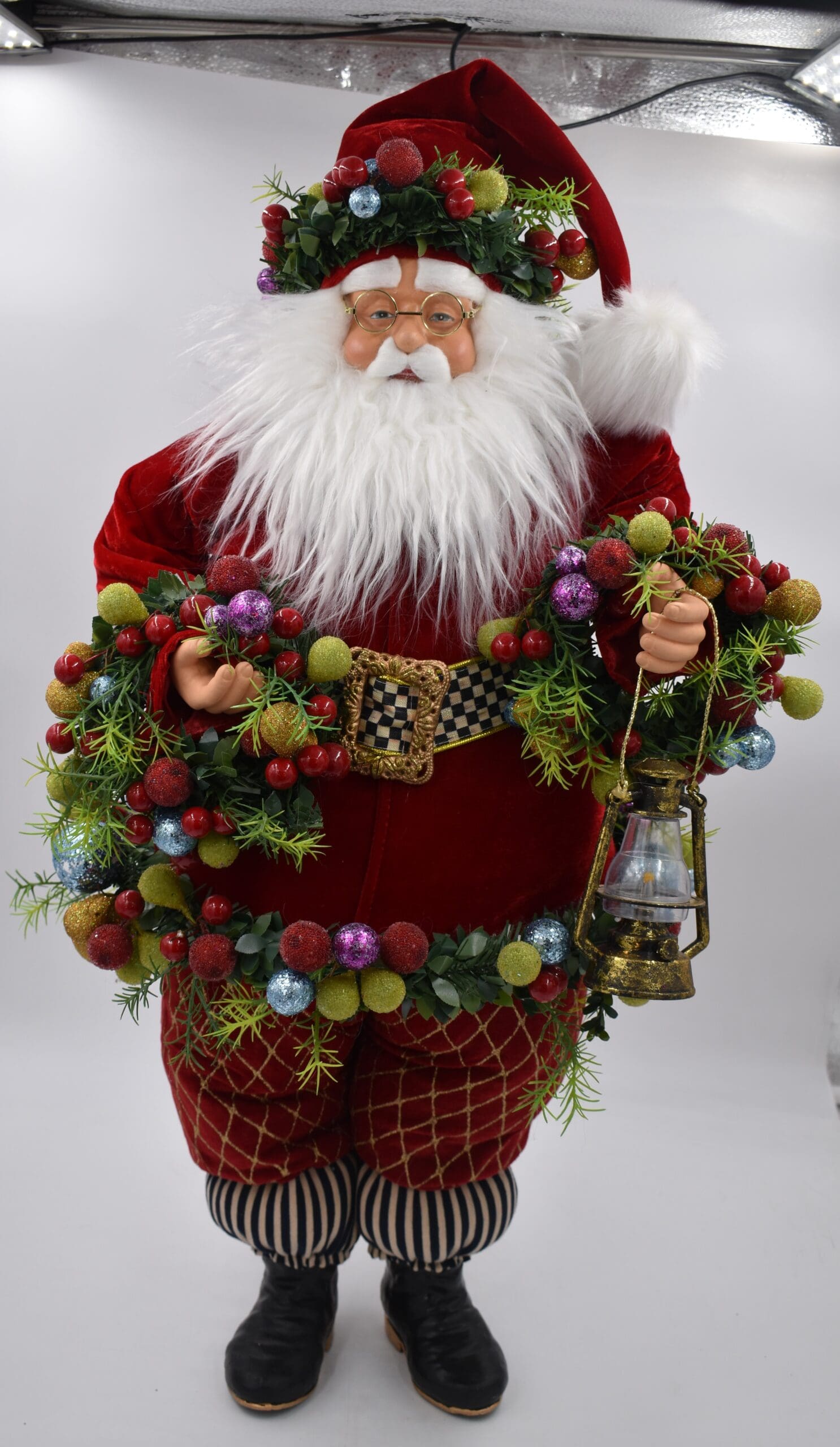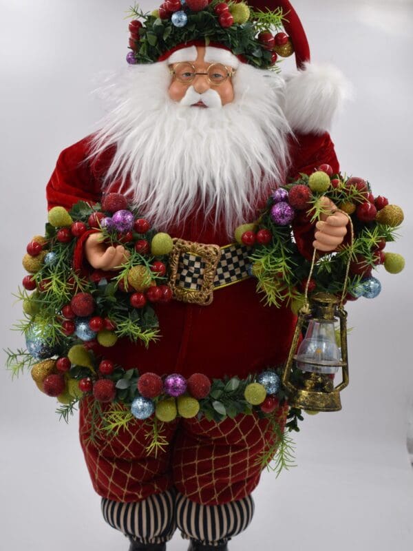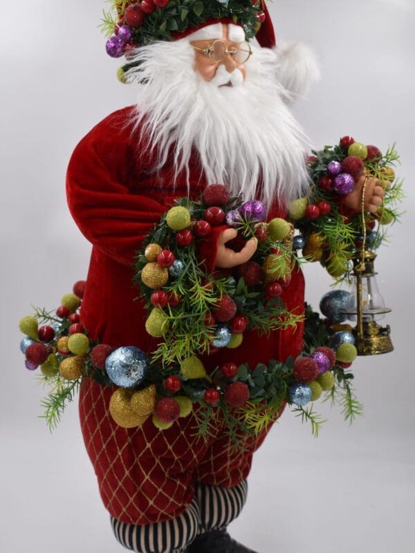 Jolly Father Christmas is a handmade and hand-painted delight, brimming with details from head to toe. Wearing a velvety red coat, accented with a Courtly Check® belt, he’s draped with a garland of ornaments and holds a golden lantern. More fruit adorns the velvety cap, too. Place this special figure in a spot near the mantel or in the entry to get all the attention it deserves.