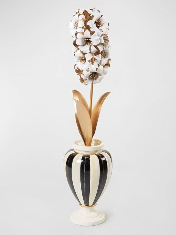 Simple and chic, our Marquee Potted Hyacinth Flower features a dimensional metal flower in a Courtly Stripe pot, accented with gold leaf. Mix and match it with the other Marquee potted flowers, including the primrose, allium, and star flower.