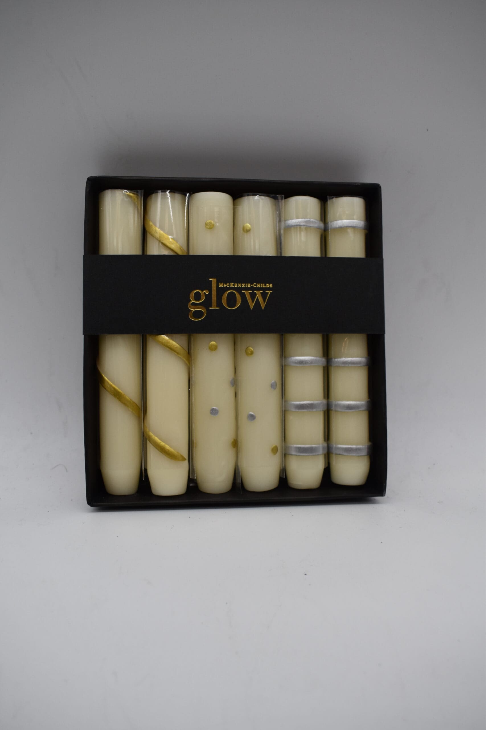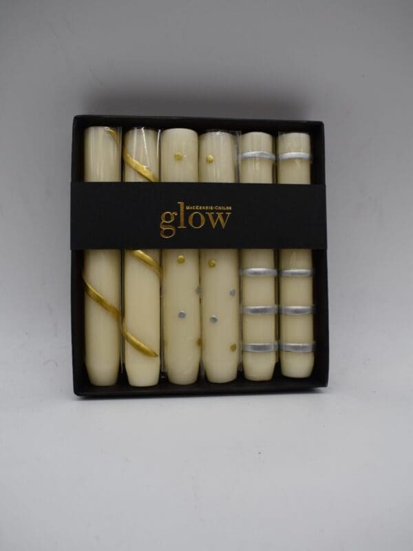 Set evenings aglow with our Gold & White Mini Dinner Candles. This suite of stout beeswax candles, trimmed in silver and gold tones, will cast a lovely lustre on your table. We also like them lined up along a mantel for a chic, grown-up take on seasonal decor.