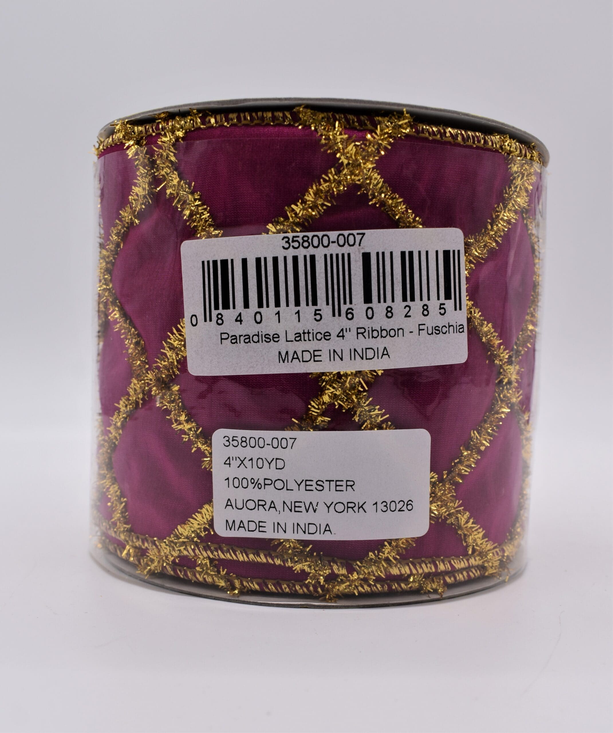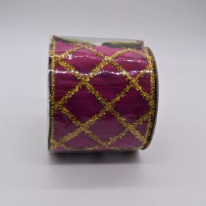 Wrap up the holidays with our 4″ Fuchsia Paradise Lattice Ribbon, which complements our Paradise collection. Decorated with a gold tinsel lattice pattern, this dupioni ribbon has wired edges for easy shaping, making it perfect to swirl around the tree or tie on a gift box. In fact, we’re so sure you’ll find no limit of uses year-round for this luxurious accent, you might want to buy more than one roll.