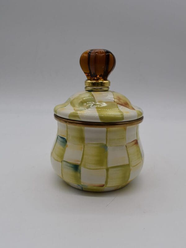 Our Parchment Check™ tabletop accessories introduce the pattern at teatime, mealtime, or whenever it’s time to celebrate. Taking your lumps becomes a delight with our Parchment Check™ Enamel Lidded Sugar Bowl-the only question is, one cube or two? But why stop at sugar-this lidded bowl is perfect for jam, sauces or elsewhere to hold anything from cotton balls to paper clips.