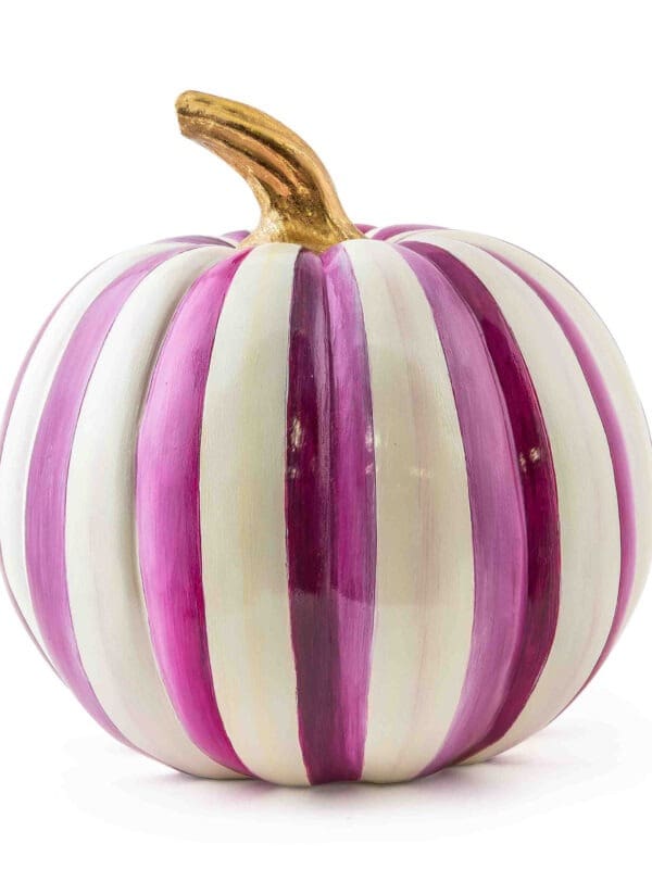 Take your pick from our most unusual pumpkin patch with a medium pumpkin, hand-painted with plum stripes and trimmed with a gold leaf stem