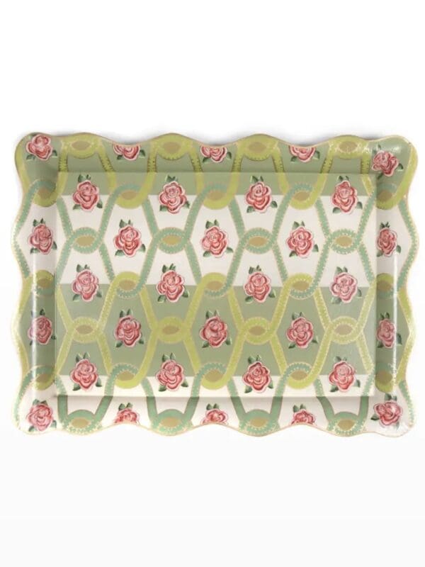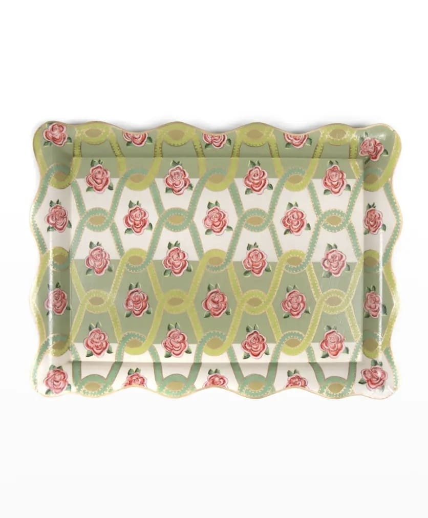 Serve in style with our Large Really Rosy Tray. Made of toleware, it features our hand-painted Roses and Ribbon pattern, decorated with a raised handled edge. Use it to serve drinks at a summer soiree or add a bit of practical style to the home office, where it could hold papers and files.