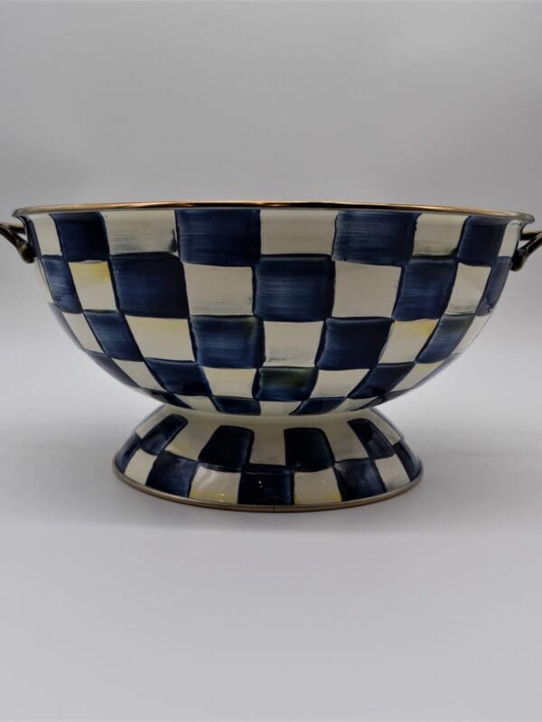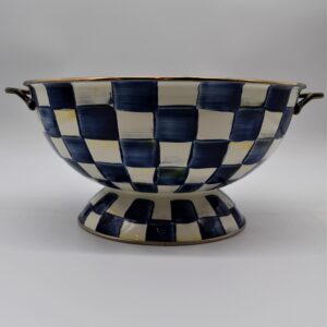 The Royal Check Everything Bowl, right-sized for beverages on ice or orchard-picked apples, is a must-have for parties and for everyday use. Heavy-gauge, hand-glazed steel underbody with hand-painted, color-dragged checks in a range of blue hues, a bronzed stainless-steel rim, and antiqued brass handles. Each piece of Royal Check reflects the artisan’s hand, so no two are exactly alike, although they all work together in perfect harmony.