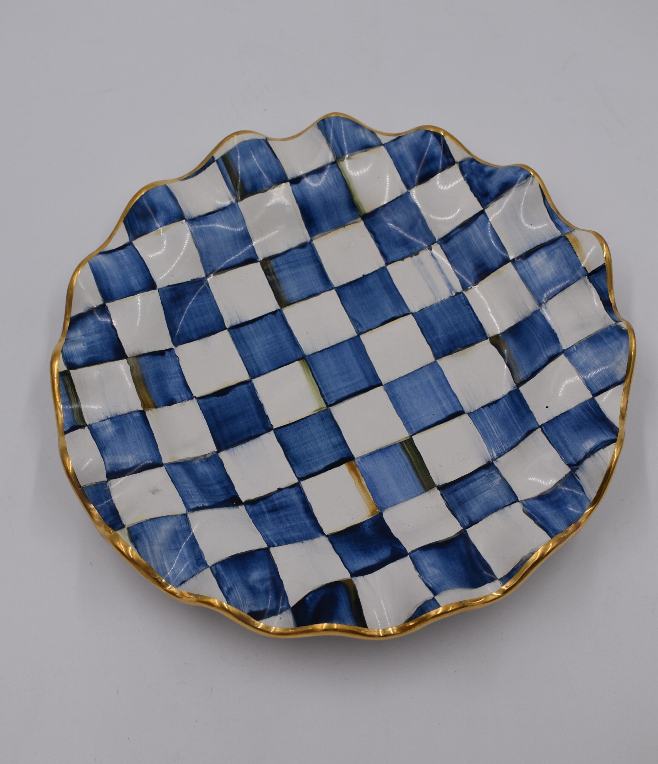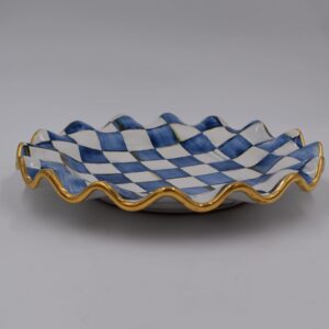 Why settle for plain plates when you can have art for the table? The rippling gold-lustred edge of our Royal Check Fluted Dinner Plate perfectly complements the hand-painted pattern for a design that is timeless and modern, formal and still fun. A beautiful juxtaposition of blue hues, our deceptively simple checks reveal an intricate spectrum of jewel-toned colors. Handmade, fired, glazed, fired again, hand-painted, embellished with luster, and fired again, each piece is stamped by the artisans involved in its creation. Each piece of Royal Check reflects the artisan’s hand, so no two are exactly alike, although they all work together in perfect harmony.