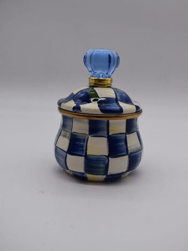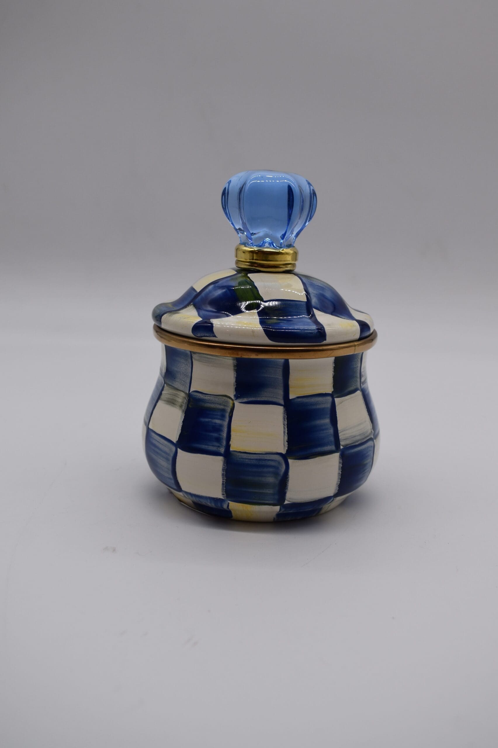 Taking your lumps becomes a delight with our Royal Check Lidded Sugar Bowl—the only question is, one cube or two? And why stop at sugar—this lidded enamel bowl is perfect for jam or sauces, or to hold anything from cotton balls to paper clips. The heavy-gauge steel underbody is glazed with hand-painted, color-dragged checks in a range of blue hues that are similar in theme to our popular Courtly Check®, rimmed in bronzed stainless steel, and topped with a blue glass knob.