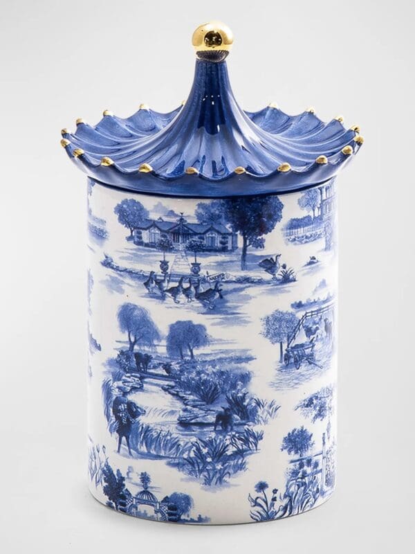 Make the powder room pretty with our ceramic Royal Toile Lidded Cachepot. It’s perfect for holding cotton balls or swabs and is decorated with landmarks from our Aurora campus, topped with a fluted lid and a bit of gold lustre.