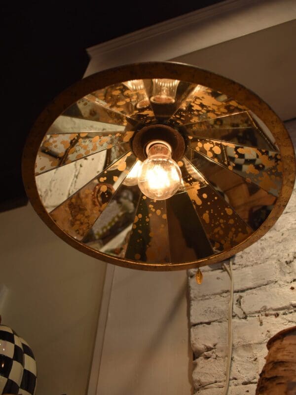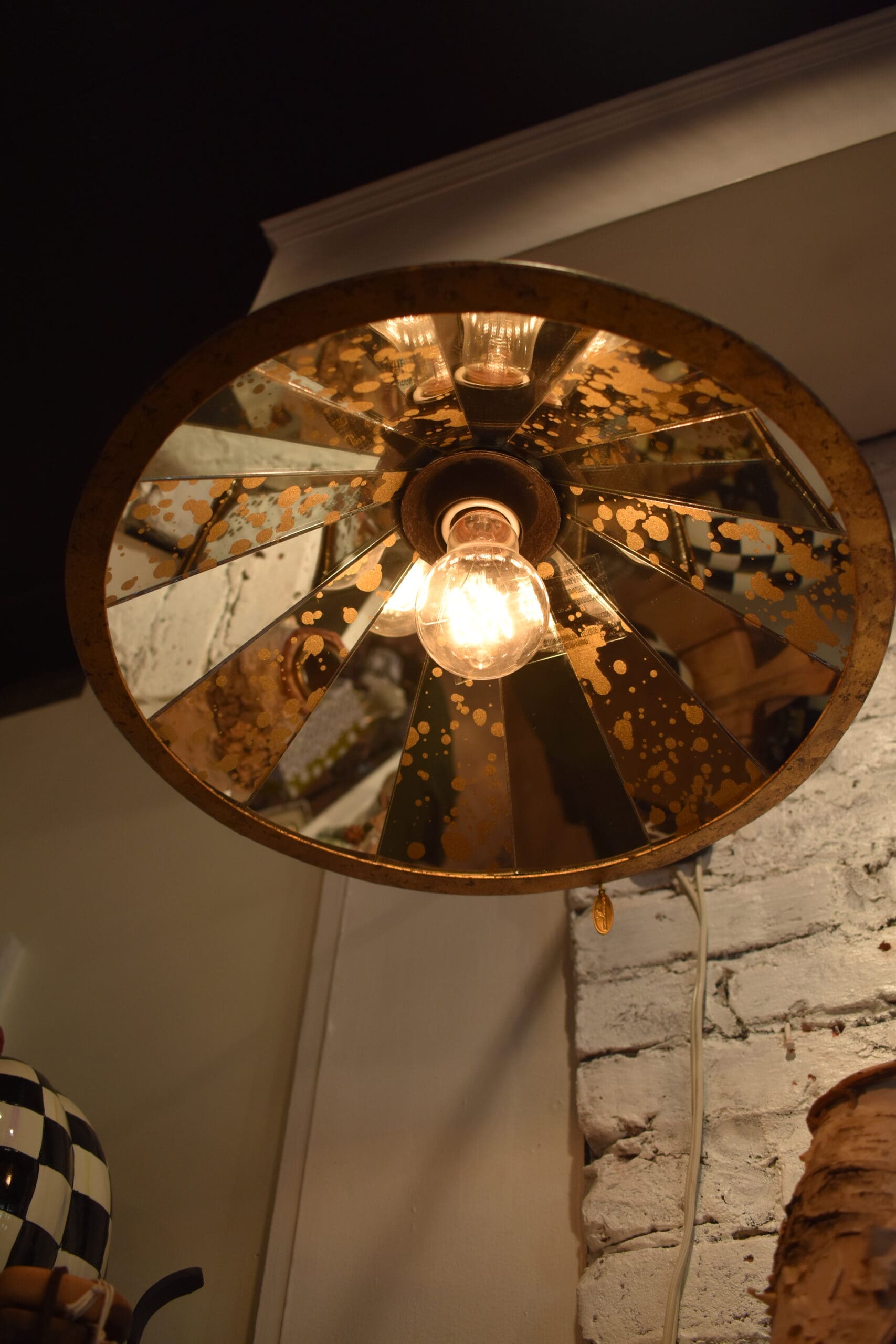Hand-painted iron with hand-painted back plate and mirrored shade interior.