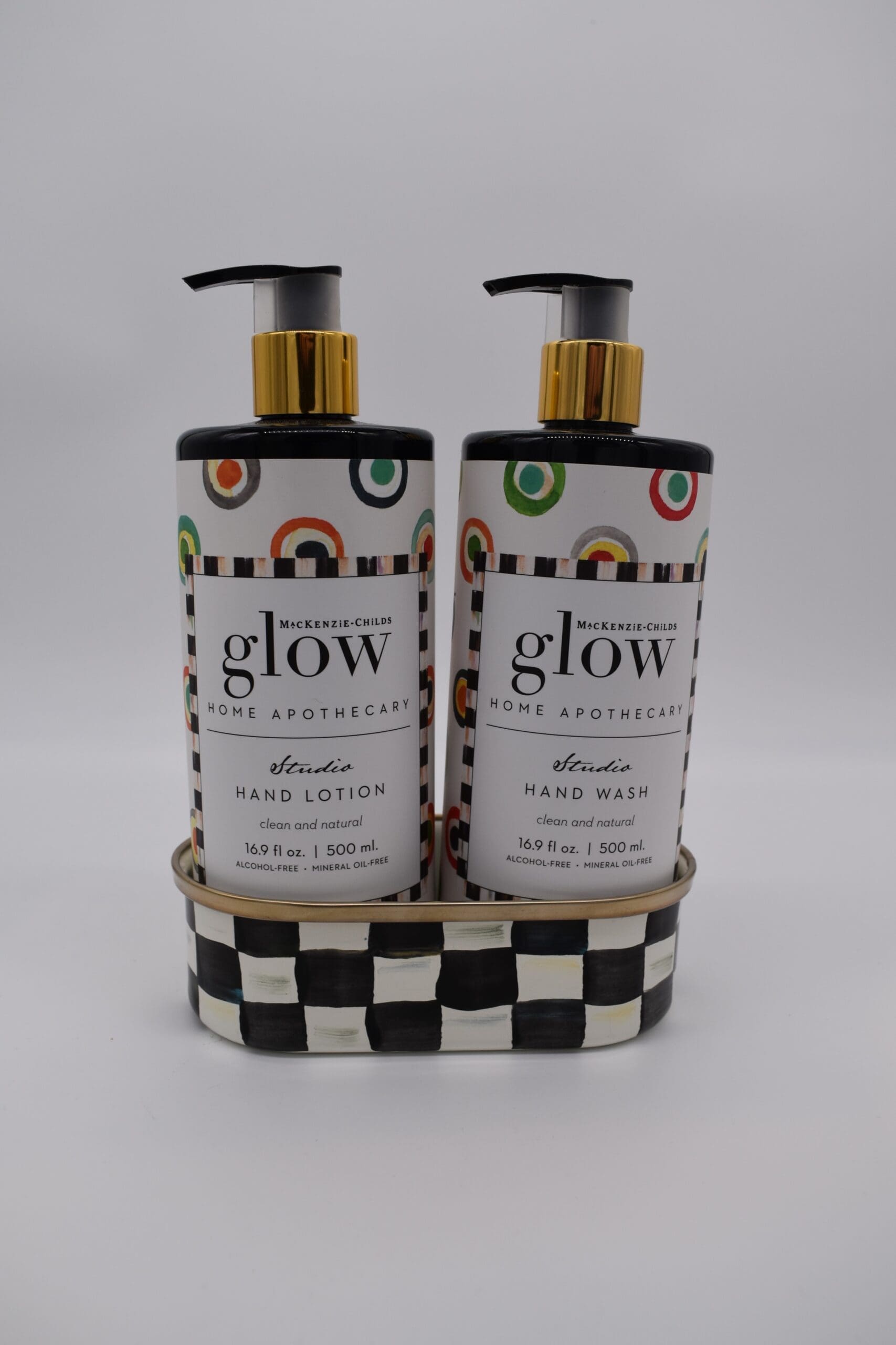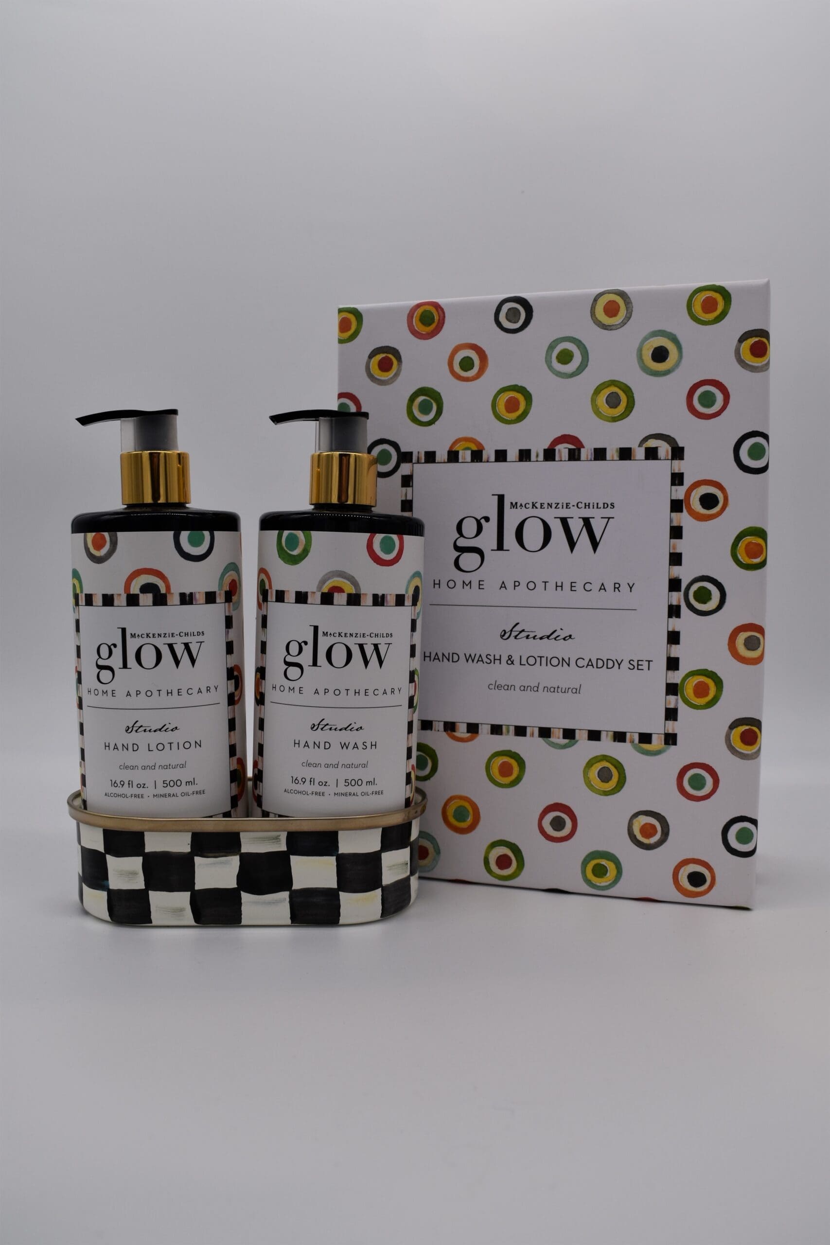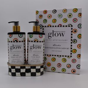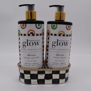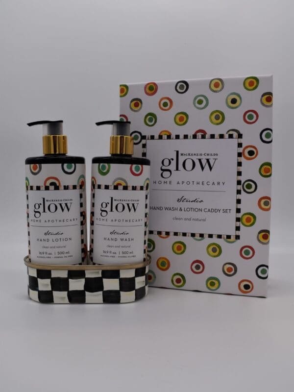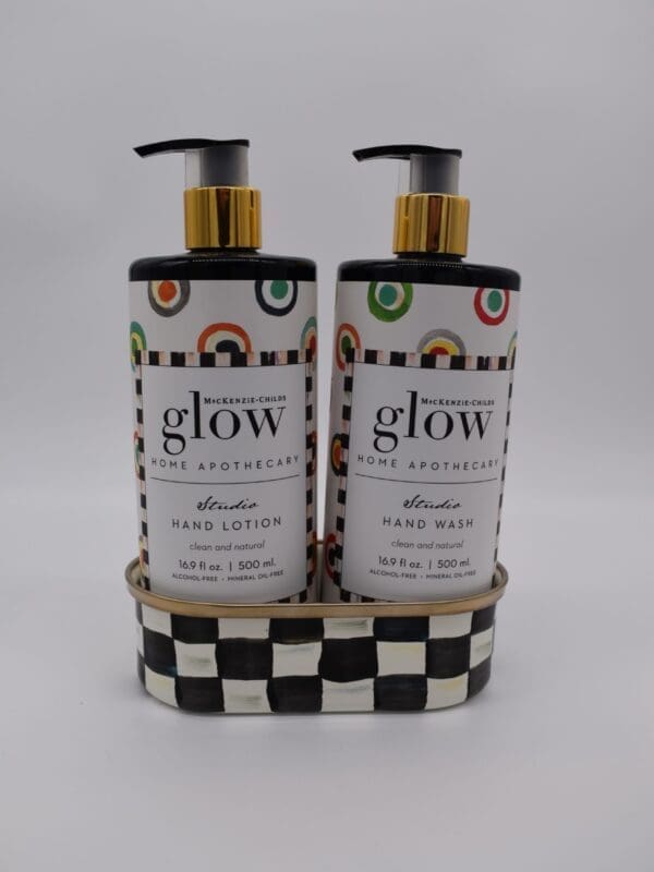MacKenzie-Childs Glow Home Apothecary defines the essence of home with fresh and inviting scents. Our Studio Soap & Lotion Caddy Set includes our Studio Hand Wash and Studio Hand Lotion presented in a Courtly Check® enamel caddy. Each fragrance-free product represents a back-to-basics approach to cleansing and moisturizing your skin that will leave it feeling refreshed.