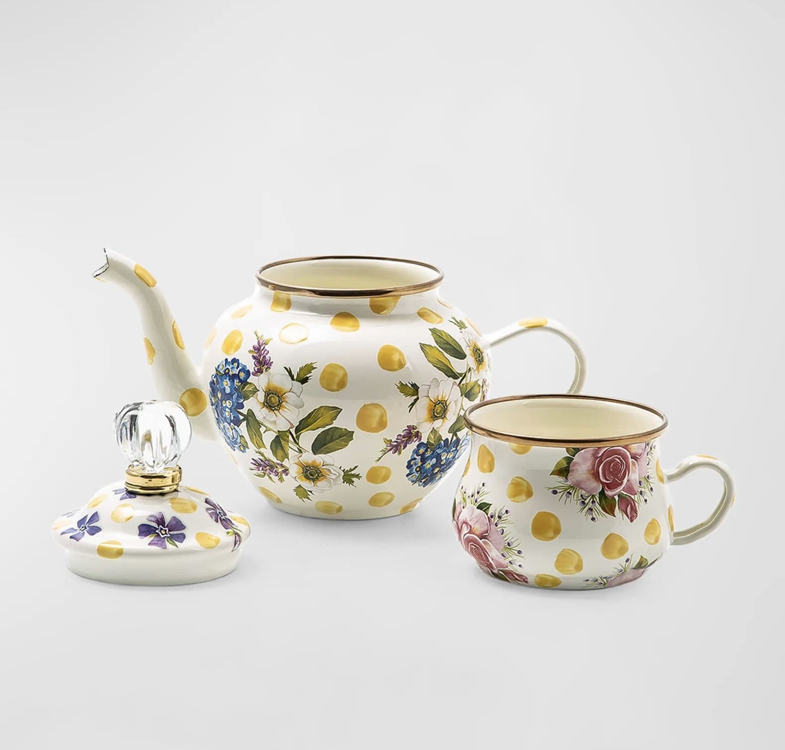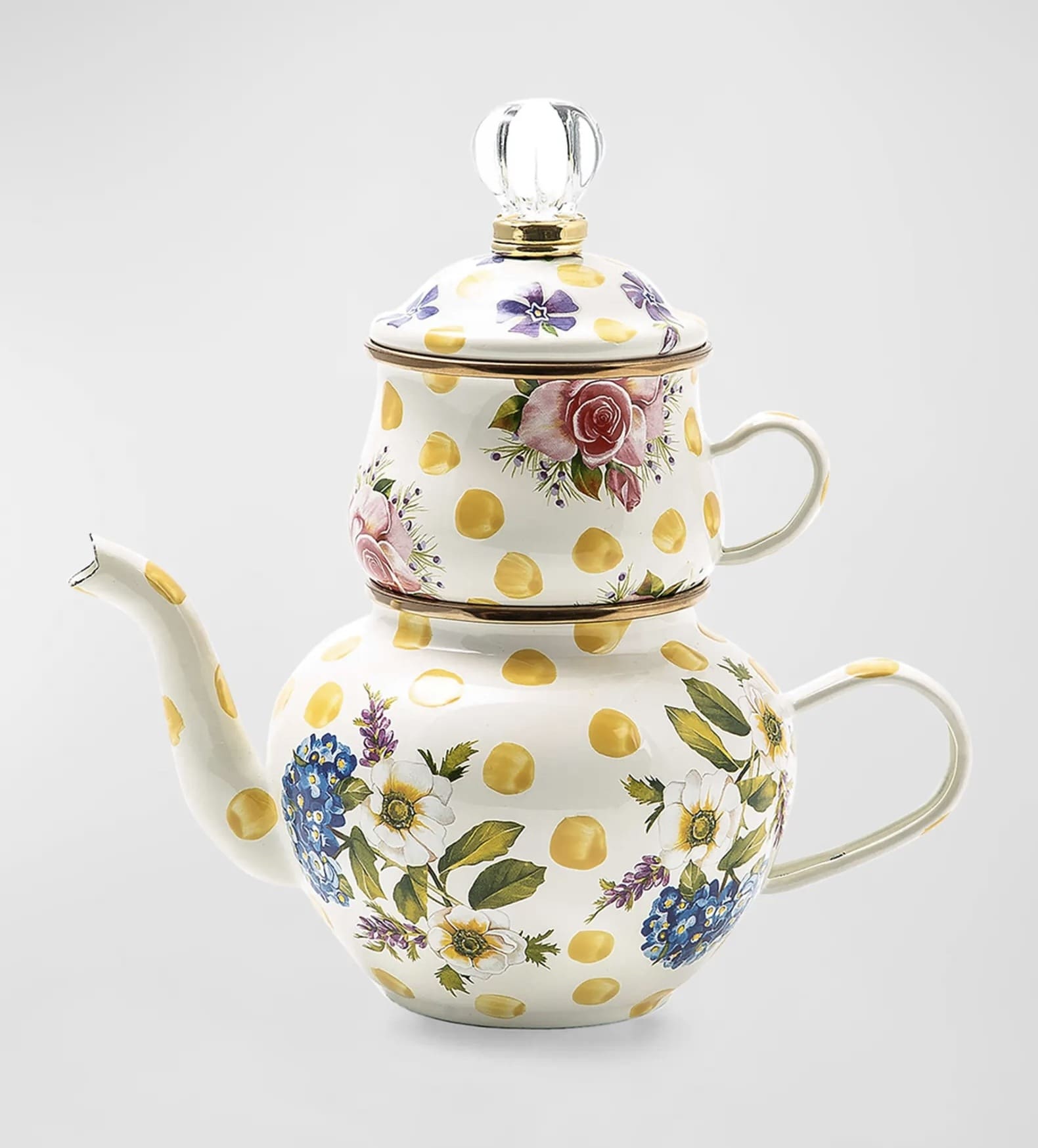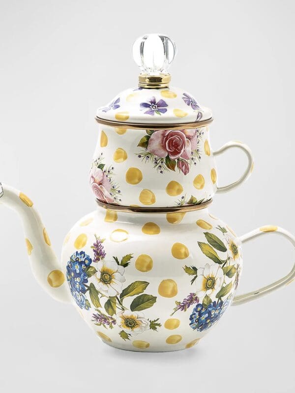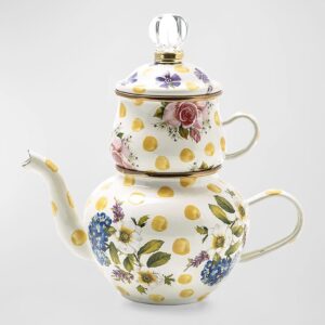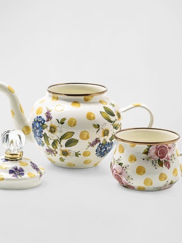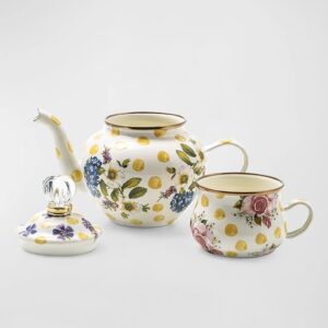 Bubbling over with MacKenzie-Childs style, our Yellow Wildflowers Enamel High Tea is ready for your personal tea party. Consisting of a pot, cup, and lid made of a heavy-gauge steel underbody is decorated with hand-applied floral transfers on hand-painted yellow splots and rimmed in bronzed stainless steel.